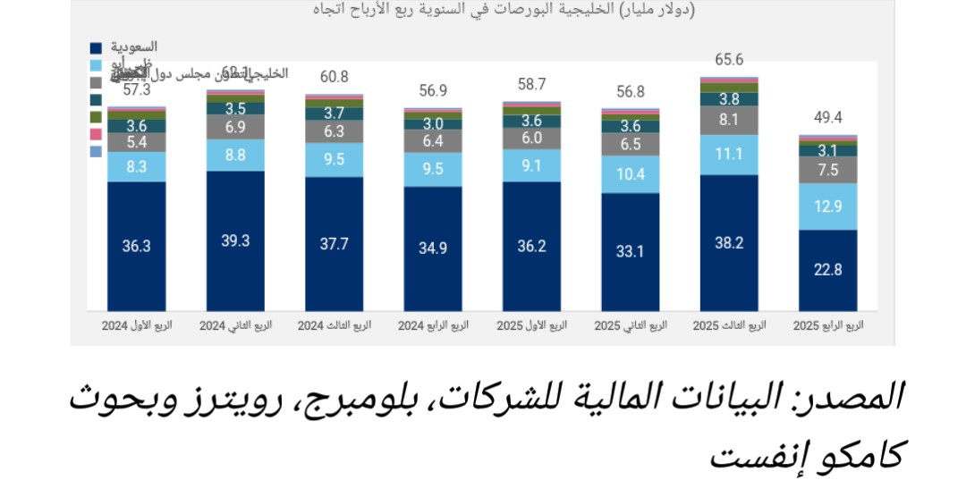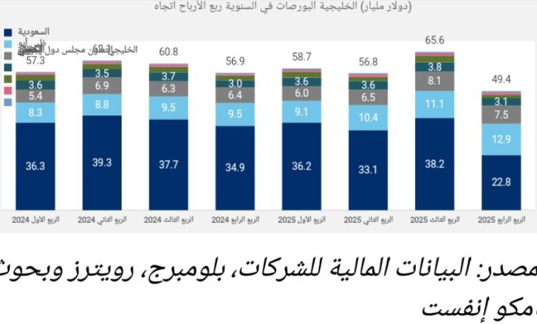 شهد صافي ربح الشركات الخليجية تراجعاً حاداً على أساس ربع سنوي خلال الربع الرابع من العام 2025، إذ انخفض بنسبة 24.7 في المائة، بما يعادل 16.2 مليار دولار أمريكي، ليصل إلى 49.4 مليار دولار أمريكي. ويعكس هذا الأداء تراجع واسع النطاق في أرباح معظم الأسواق، والذي فاق تأثير النمو المسجل في أرباح الشركات المدرجة في كل من أبوظبي والبحرين.