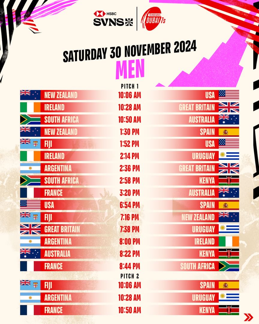 ووفقا للجدول المعتمد وبعد فوزه بثلاثية متتالية في طيران الإمارات لسباعيات دبي للرجبي في 2021 و2022 و2023، سيواجه فريق جنوب أفريقيا أستراليا في الساعة 10:50 صباحاً، بينما يعود فريق كينيا بعد غياب عام في الساعة 2:58 ظهراً لمواجهة فريق جنوب أفريقيا المنتصر “بليتزبوكس- Blitzboks’.