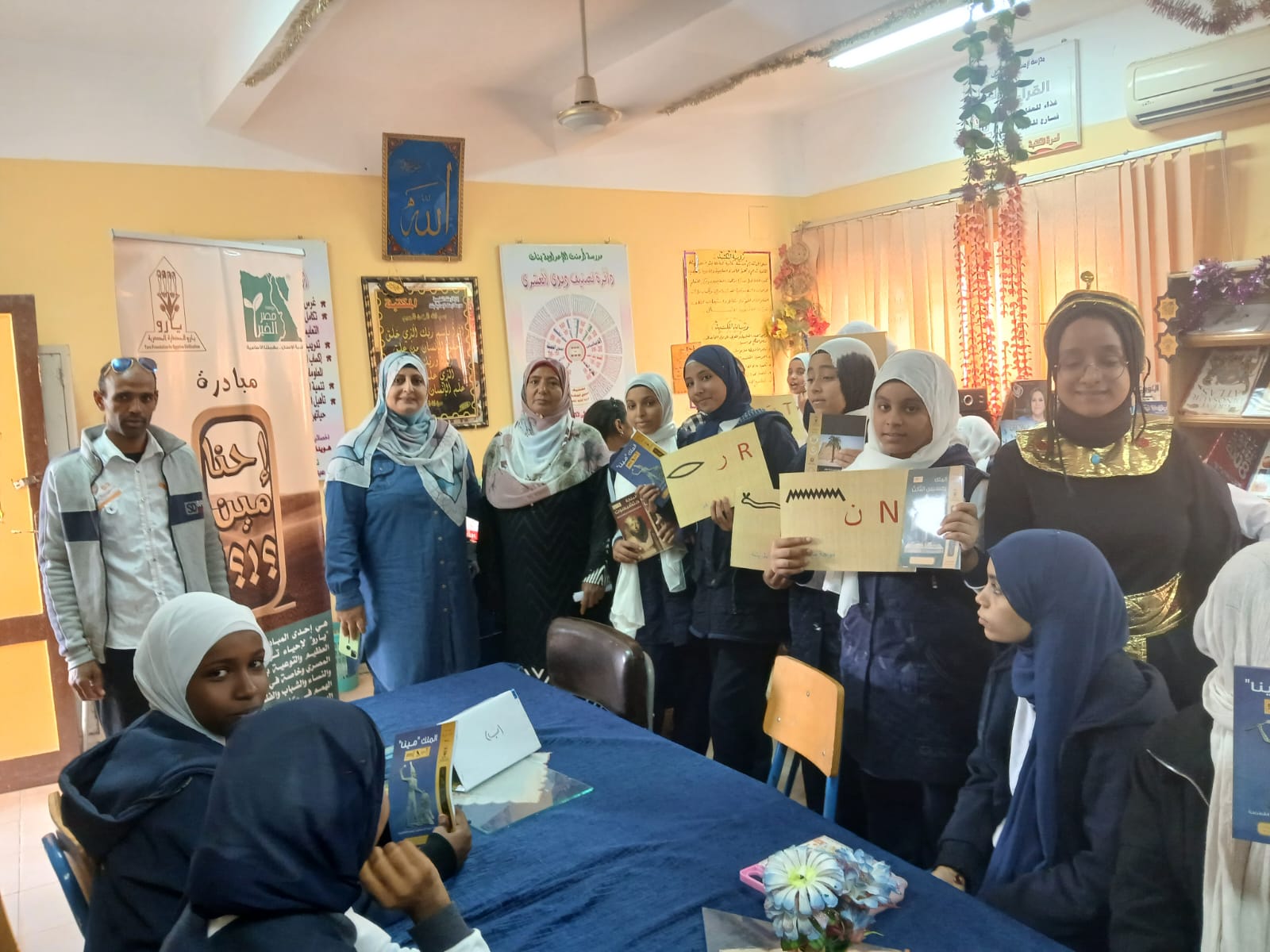 مدرسة أرمنت الإعدادية بنات اللاتى حضرن الورش وتعلمن كتابة اسمهن بالهيروغليفية واستعرضوا اشكال حروفها
