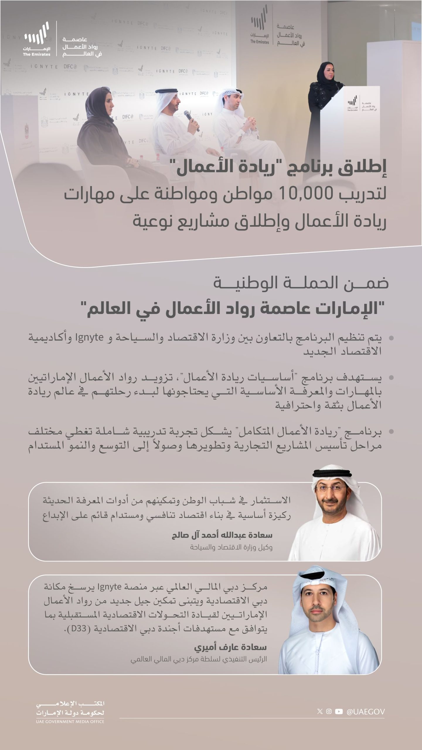 ويأتي البرنامج ضمن الحملة الوطنية “الإمارات عاصمة رواد الأعمال في العالم”، التي أطلقها صاحب السمو الشيخ محمد بن راشد آل مكتوم، نائب رئيس الدولة، رئيس مجلس الوزراء، حاكم دبي، “رعاه الله”، بهدف ترسيخ مكانة دولة الإمارات كوجهة عالمية لريادة الأعمال، من خلال مجموعة متكاملة من البرامج والمبادرات التي تدعم الشباب الإماراتي وتُمكّنهم من تأسيس المشاريع، وتحفّز الابتكار، وتُسهم في تنويع الاقتصاد الوطني.