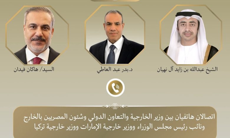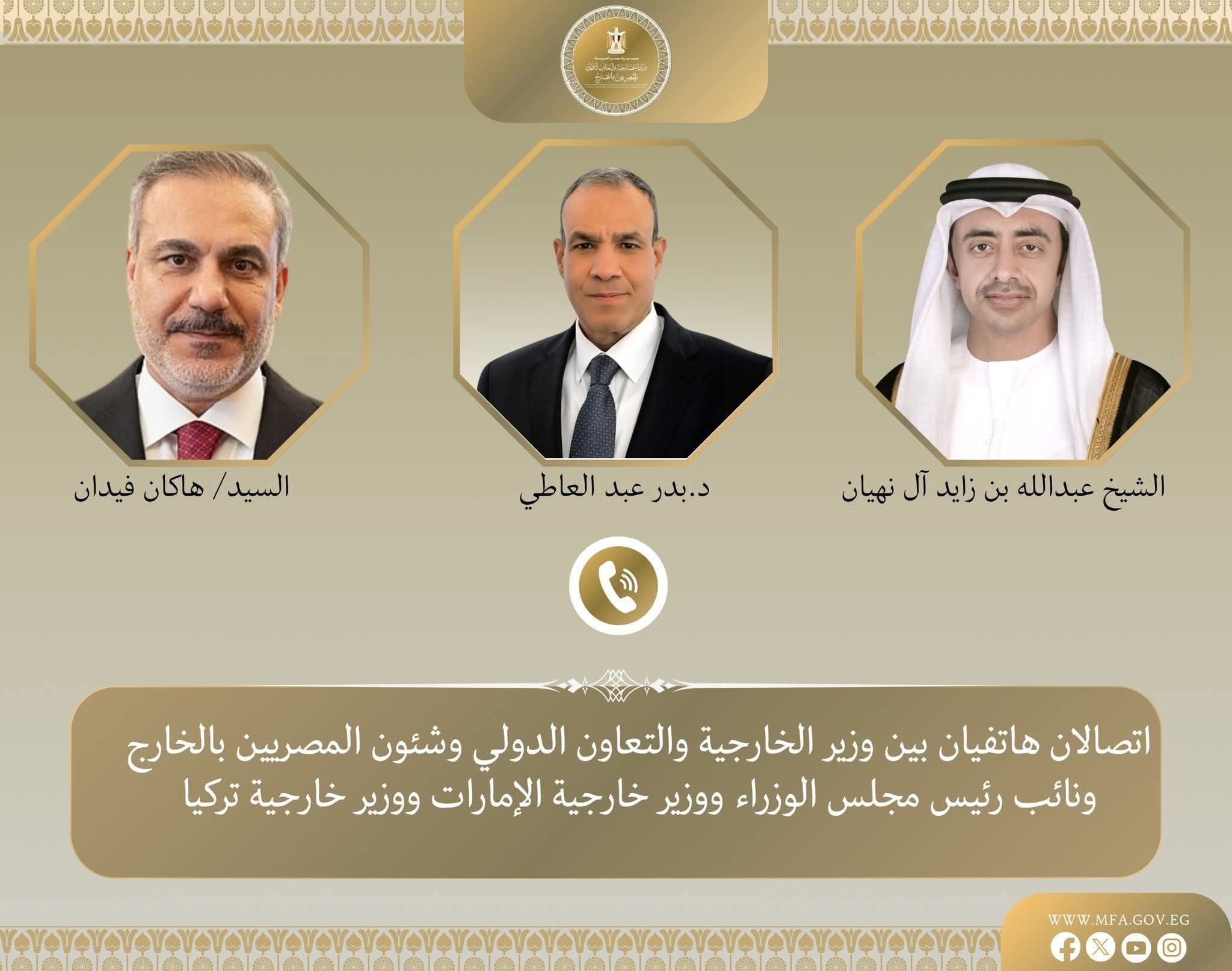 فى إطار متابعة تداعيات التصعيد العسكري بالمنطقة، أجرى د. بدر عبد العاطي وزير الخارجية والتعاون الدولي والمصريين بالخارج اتصالين هاتفيين مع كل من الشيخ عبد الله بن زايد آل نهيان نائب رئيس مجلس الوزراء ووزير الخارجية بدولة الإمارات العربية المتحدة الشقيقة، والسيد هاكان فيدان وزير خارجية الجمهورية التركية، يوم الثلاثاء ١٠ مارس.