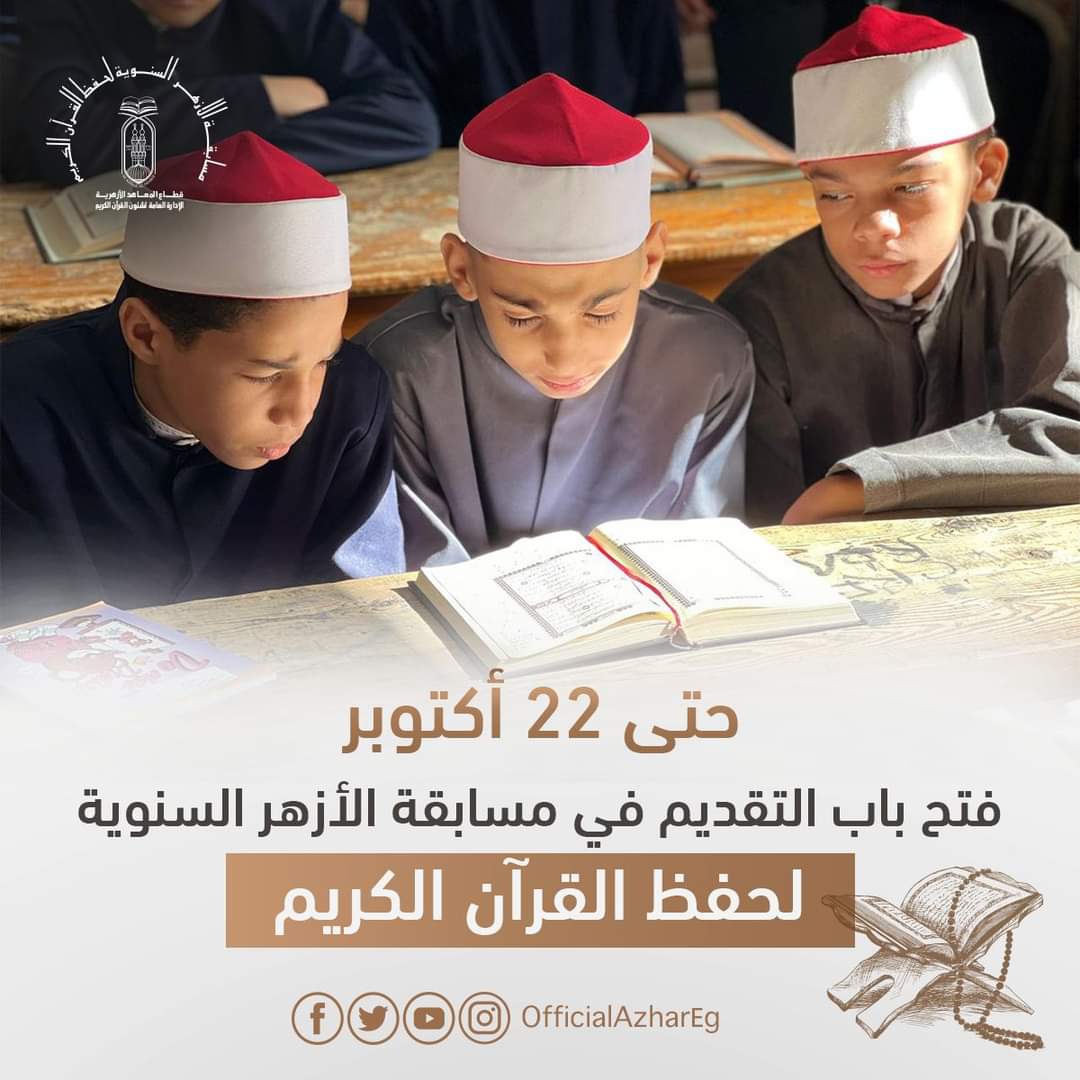 بعد النجاح البارز الذي حققته، أعلن الأزهر الشريف عن فتح باب التقدم لمسابقة الأزهر السنوية لحفظ القرآن الكريم، للعام 2024 – 2025، بدءًا من 7 أكتوبر وحتى 22 أكتوبر.