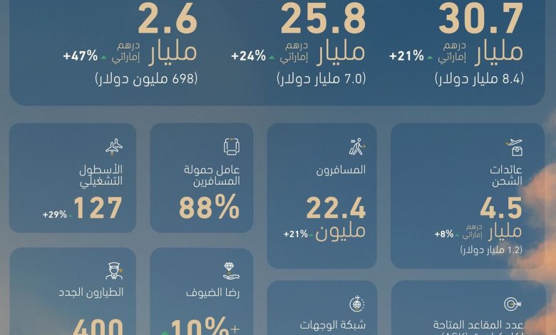 وارتفع إجمالي الإيرادات بنسبة 21% على أساس سنوي ليصل إلى 30.7 مليار درهم “8.4 مليار دولار”، مدفوعاً بالتوسع القوي في قطاعي المسافرين والشحن.