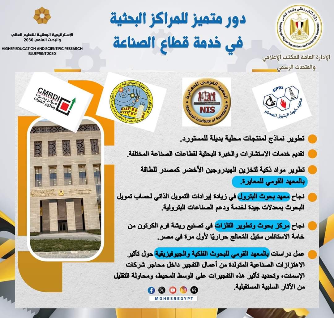 أكد د. أيمن عاشور وزير التعليم العالى والبحث العلمى على الدور الحيوى للبحث العلمى فى خدمة قطاع الصناعة، مشيرًا إلى أن الجهود التى قامت بها المراكز البحثية التابعة للوزارة فى توجيه البحوث العلمية لخدمة أهداف الصناعة، قد حققت العديد من النتائج المتميزة التى ساهمت فى دعم الصناعات وتوفير بدائل محلية، لافتًا إلى أن ربط البحث العلمى بمتطلبات التنمية يأتى على رأس أولويات العمل للوزارة فى إطار تنفيذ الإستراتيجية الوطنية للتعليم العالى والبحث العلمى التى أطلقتها الوزارة.