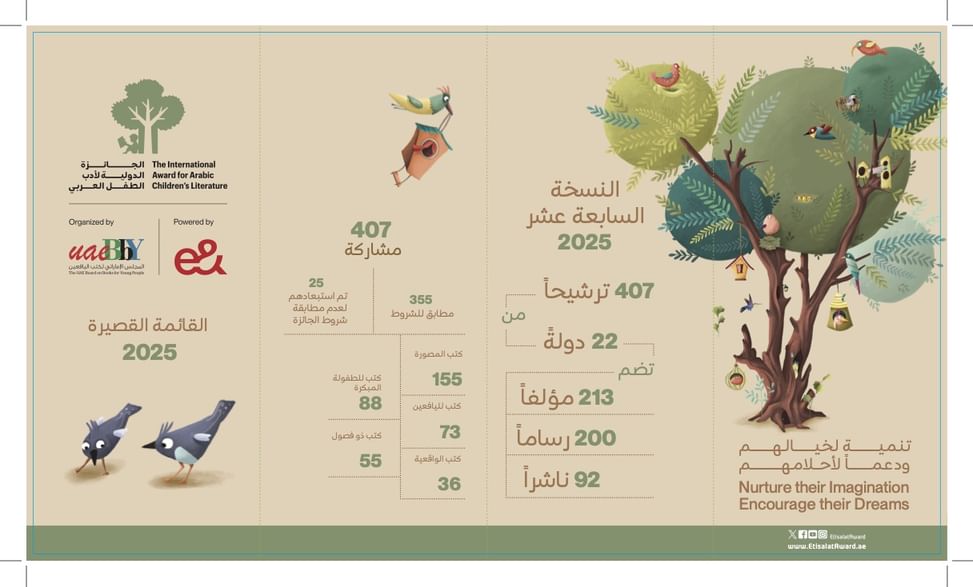 و استقبلت الجائزة 407 أعمال من 22 دولة قدمها 280 مؤلفا و263 رساما و116 ناشرا ما يعكس تنامي الثقة بها عربيا ويؤكد تطور صناعة كتب الأطفال في العالم العربي.