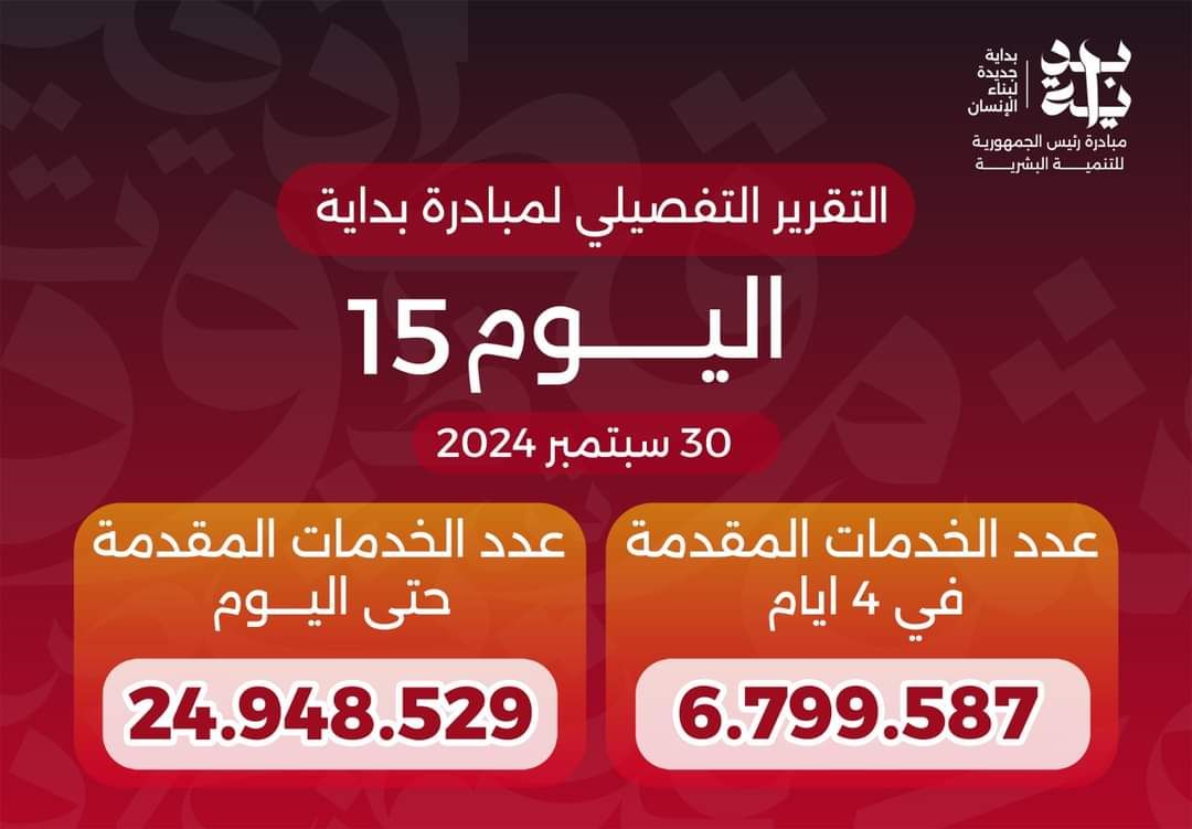 وتضمنت فعاليات المبادرة خلال الأربعة أيام الماضية، تقديم 118 ألفا 758 خدمة في مختلف الأنشطة والفعاليات الشبابية والرياضية، وتم تنفيذ حملات توعية من خلال الرائدات الاجتماعيات، استفاد منها 245 ألفا و158 مواطنا، ومساعدات اجتماعية (تعليم، ومنح، وزواج، وتعويضات) لـ 9 ألفا و578 مواطن، إلى جانب توزيع 726 بطاقة إثبات الإعاقة والخدمات المتكاملة، وتنفيذ حملات طرق الأبواب للتوعية عن مخاطر الإدمان والتعاطي لـ8 آلاف و587 شاب وشابة، وتقديم خدمات تأهيلية، وعلاجية وأجهزة تعويضية لـ 774 من ذوي الاحتياجات الخاصة، علاوة على تقديم 5 ملايين و943 ألف خدمة صحية، من خلال 482 قافلة طبية، تشمل خدمات علاجية ووقائية وتنظيم الأسرة، وزيارات منزلية، وزيارات متابعة الحمل، ونمو الطفل.