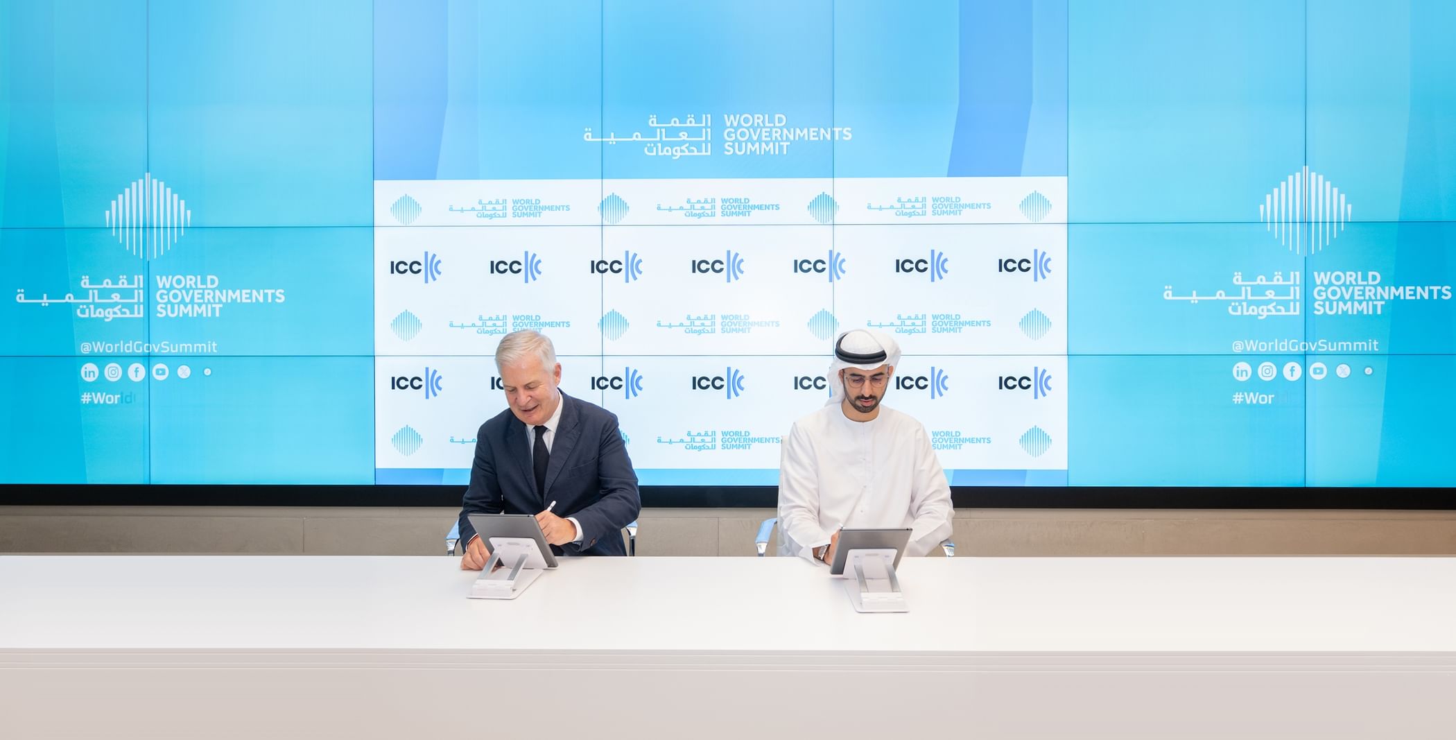 وقع اتفاقية الشراكة معالي عمر سلطان العلماء وزير دولة للذكاء الاصطناعي والاقتصاد الرقمي وتطبيقات العمل عن بعد، نائب رئيس مؤسسة القمة العالمية للحكومات، وسعادة جون دينتون الأمين العام لغرفة التجارة الدولية.