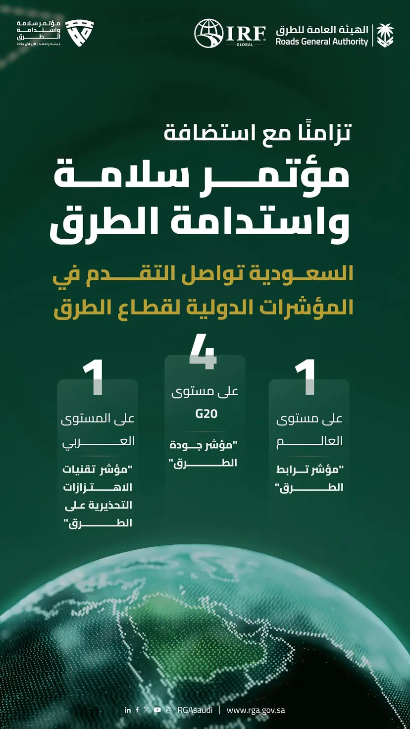 يذكر أن مؤتمر سلامة واستدامة الطرق العالمي تعقد أعماله في الثالث والرابع من نوفمبر القادم، بمشاركة أكثر من 1000 خبير ومهتم من أكثر من 50 دولة من أنحاء العالم.