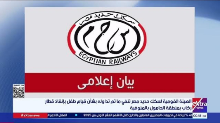 الهيئة القومية لسكك حديد مصر تنفي ما تم تداوله بشأن قيام طفل بإنقاذ قطار ركاب بمنطقة الحامول بالمنوفية