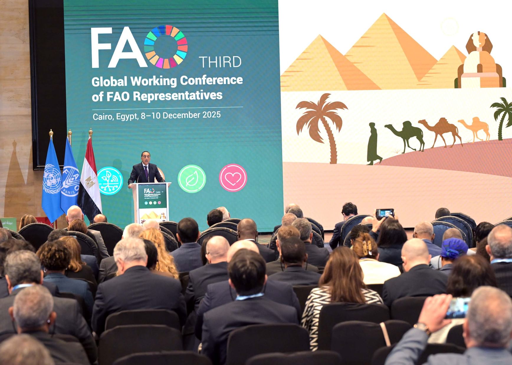 وأكد الدكتور مصطفى مدبولي دعم مصر للتعاون مع الفاو وتطوير نظم أكثر مرونة، مشيرا إلى أن الأمن الغذائي العالمي يتطلب عملا دوليا مشتركا، موضحا أهمية تعزيز الإنتاج الزراعي ورفع القدرة على مواجهة التغيرات المناخية.