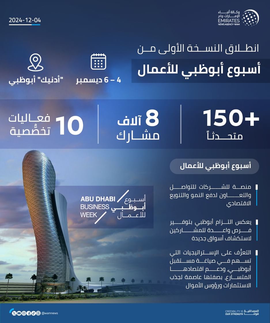 وتُقام فعاليات “أسبوع أبوظبي للأعمال” تحت شعار “إحداث الأثر، صنع الفرق” بمشاركة أكثر من 150 متحدثاً و8 آلاف مشارك من صنّاع القرار والرؤساء التنفيذيين والمستثمرين الدوليين وروّاد الأعمال لاستكشاف الفرص التي تتيحها المنظومة الاقتصادية الداعمة للأعمال في أبوظبي وبناء الشراكات الإستراتيجية التي تسهم في دفع عجلة التنمية الاقتصادية والمستدامة.