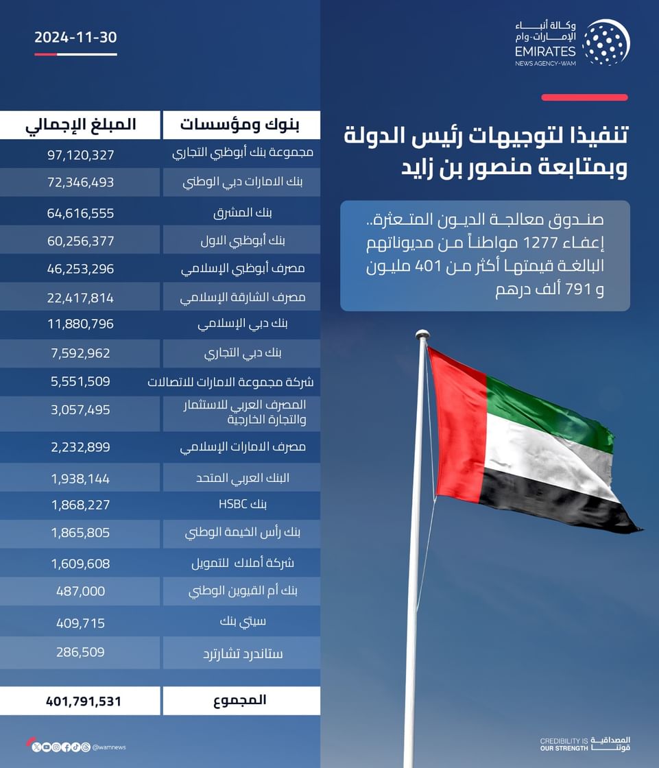 تنفيذاً لتوجيهات صاحب السمو الشيخ محمد بن زايد آل نهيان رئيس الدولة “حفظه الله” ، وبمتابعة سمو الشيخ منصور بن زايد آل نهيان نائب رئيس الدولة نائب رئيس مجلس الوزراء رئيس ديوان الرئاسة، أعلن “صندوق معالجة الديون المتعثرة” إعفاء 1277مواطناً من مديونياتهم بقيمة إجمالية تبلغ أكثر من 401 مليون و791 ألف درهم، وذلك بالتعاون مع 18 بنكاً ومصرفاً ومؤسسة في الدولة.