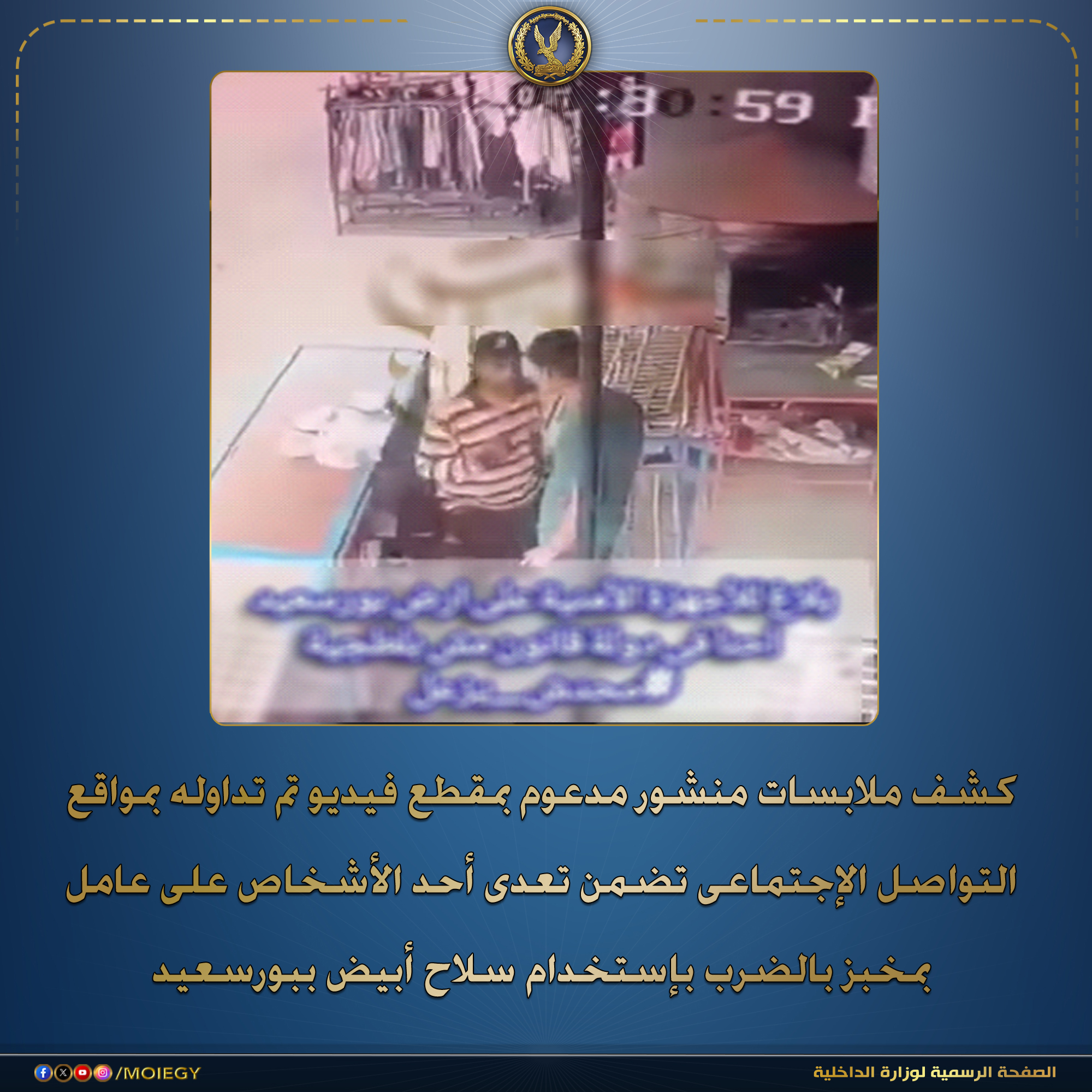 فى إطار كشف ملابسات منشور مدعوم بمقطع فيديو تم تداوله بمواقع التواصل الإجتماعى تضمن تعدى أحد الأشخاص على عامل بمخبز بالضرب بإستخدام سلاح أبيض ببورسعيد.