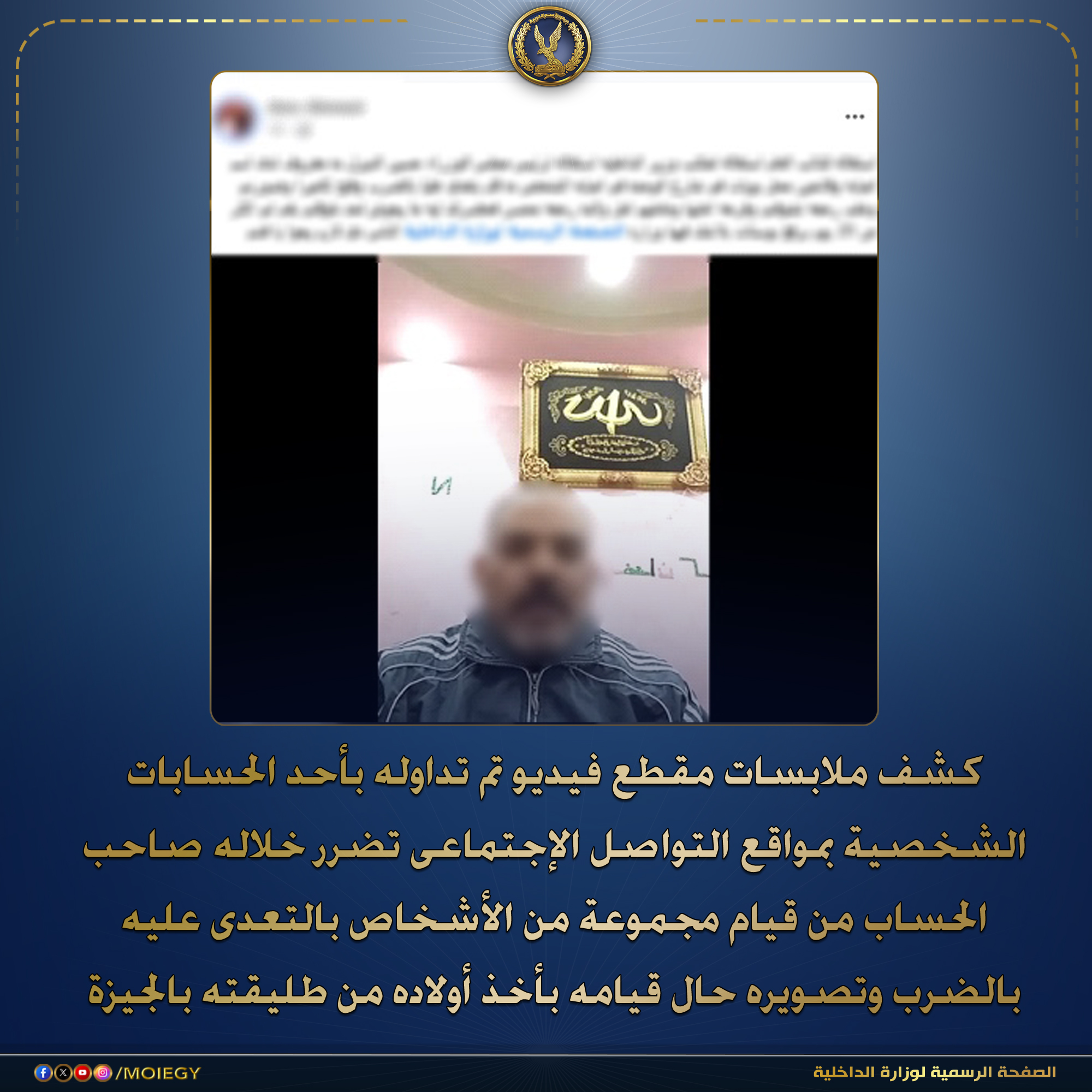 فى إطار كشف ملابسات مقطع فيديو تم تداوله بأحد الحسابات الشخصية بمواقع التواصل الإجتماعى تضرر خلاله صاحب الحساب من قيام مجموعة من الأشخاص بالتعدى عليه بالضرب وتصويره حال قيامه بأخذ أولاده من طليقته بالجيزة .