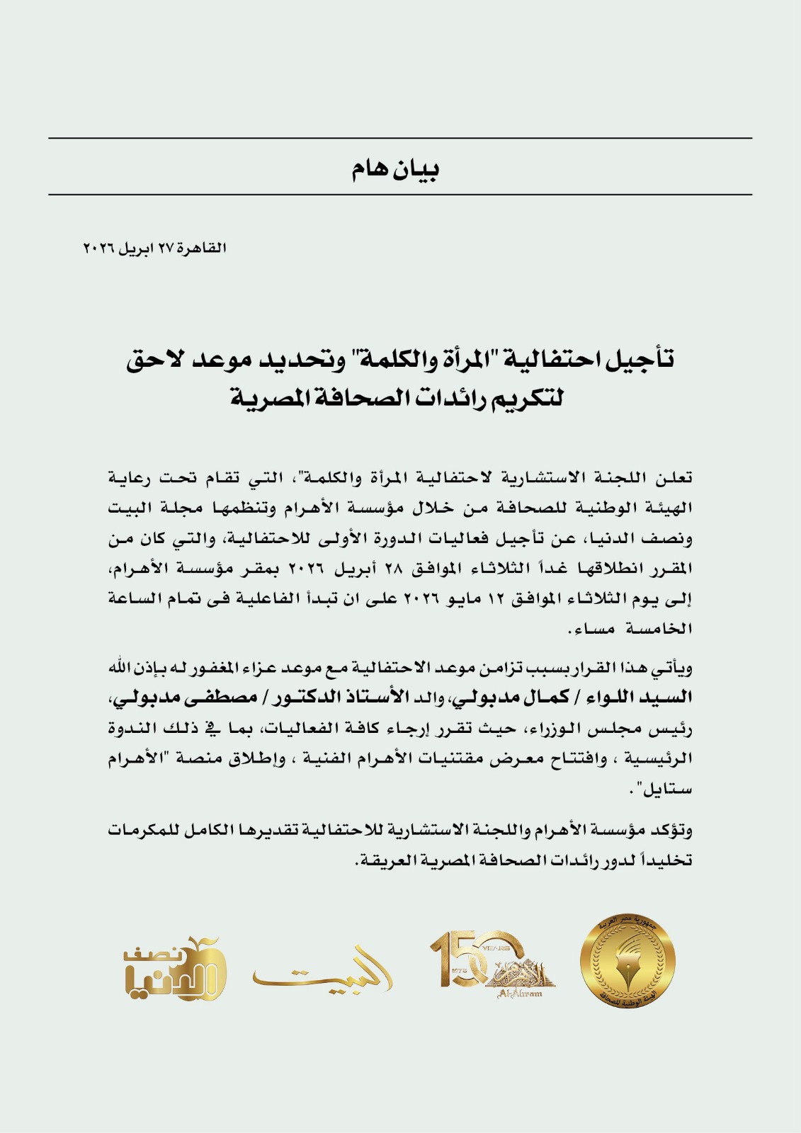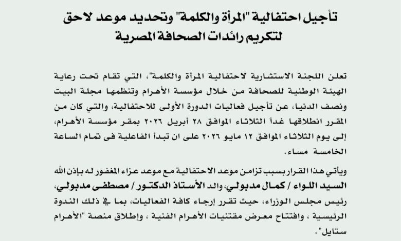 تعلن اللجنة الاستشارية لاحتفالية المرأة والكلمة”، التي تقام تحت رعاية الهيئة الوطنية للصحافة من خلال مؤسسة الأهرام وتنظمها مجلة البيت ونصف الدنيا، عن تأجيل فعاليات الدورة الأولى للاحتفالية، والتي كان من المقرر انطلاقها غداً الثلاثاء الموافق ٢٨ أبريل ٢٠٢٦ بمقر مؤسسة الأهرام، إلى يوم الثلاثاء الموافق ١٢ مايو ٢٠٢٦ ، على ان تبدأ الفاعلية فى تمام الساعة الخامسة مساء.