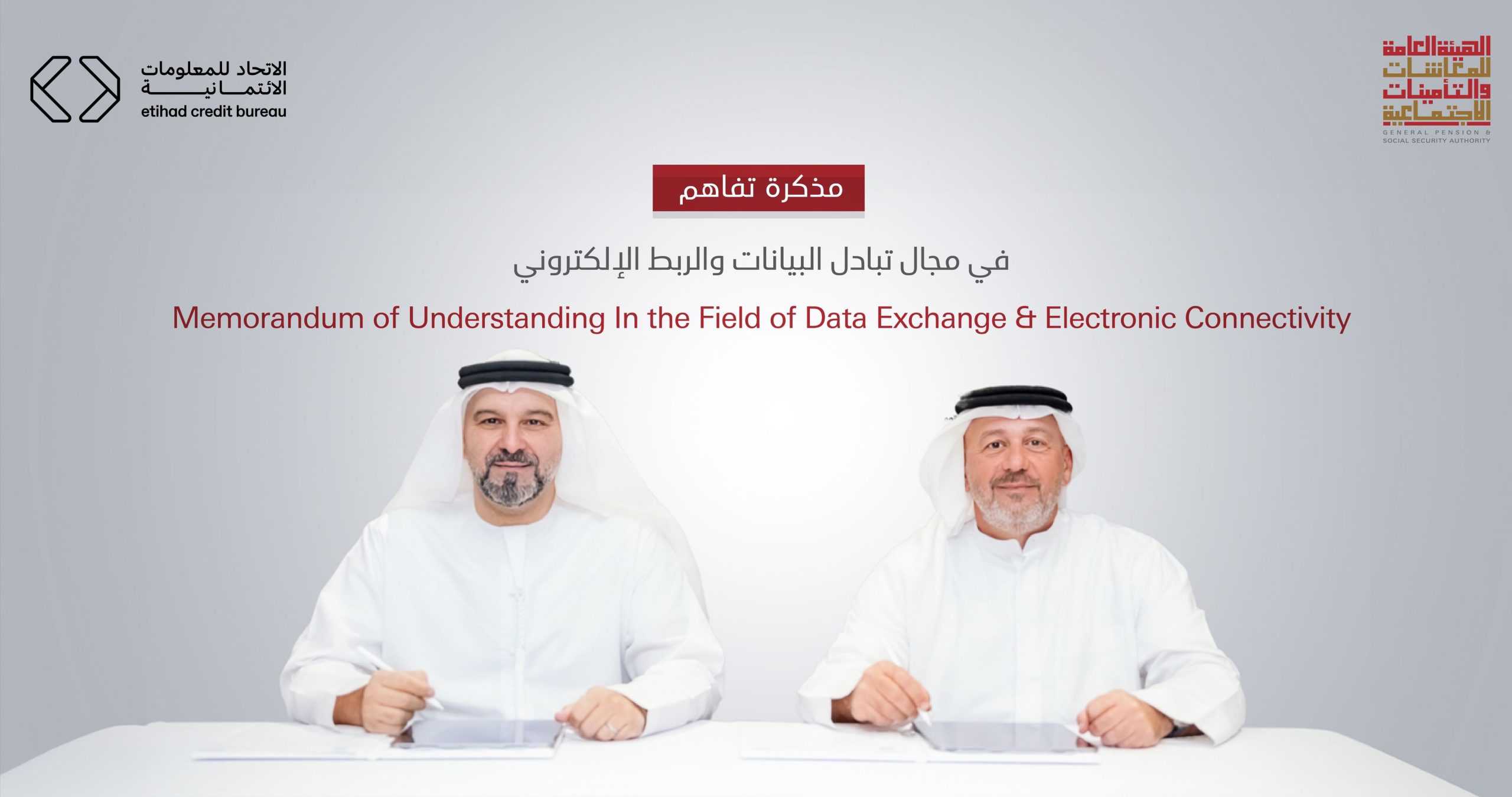 وتهدف المذكرة إلى تعزيز التعاون والشراكة بين الجانبين في مجال تبادل البيانات وفق أطر العمل المشتركة التي تتضمن تعزيز القدرة التنافسية وتطوير الخدمات الاستباقية والمبادرات والمشاريع التي تدعم منظومة التحول الرقمي في الدولة، إضافة إلى تطوير قواعد البيانات لدعم إجراء الدراسات والتحليلات ونشر المعلومات والإحصائيات، والاستفادة من منتجات بيانات الائتمان المتقدمة لتقييم السلامة المالية والاستقرار لشركات القطاع الخاص فيما يتعلق بمدى قدرتها على الوفاء بالتزاماتها تجاه مساهمات معاشات الموظفين حالاً ومستقبلاُ .