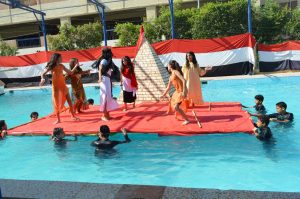 وقد تضمن العرض الضربة الجوية، والضفادع البشرية لمسح القناة من قنابل النابالم ثم عبور قناة السويس الممثلة في حمام السباحة بالمدرسة، واظهر العرض دور سلاح المهندسين في إنشاء الكباري لعبور القناة. وايضا سلاح المشاة ودوره في تحطيم خط بارليف ورفع علم مصر تأكيدا لانتصارها الكبير.