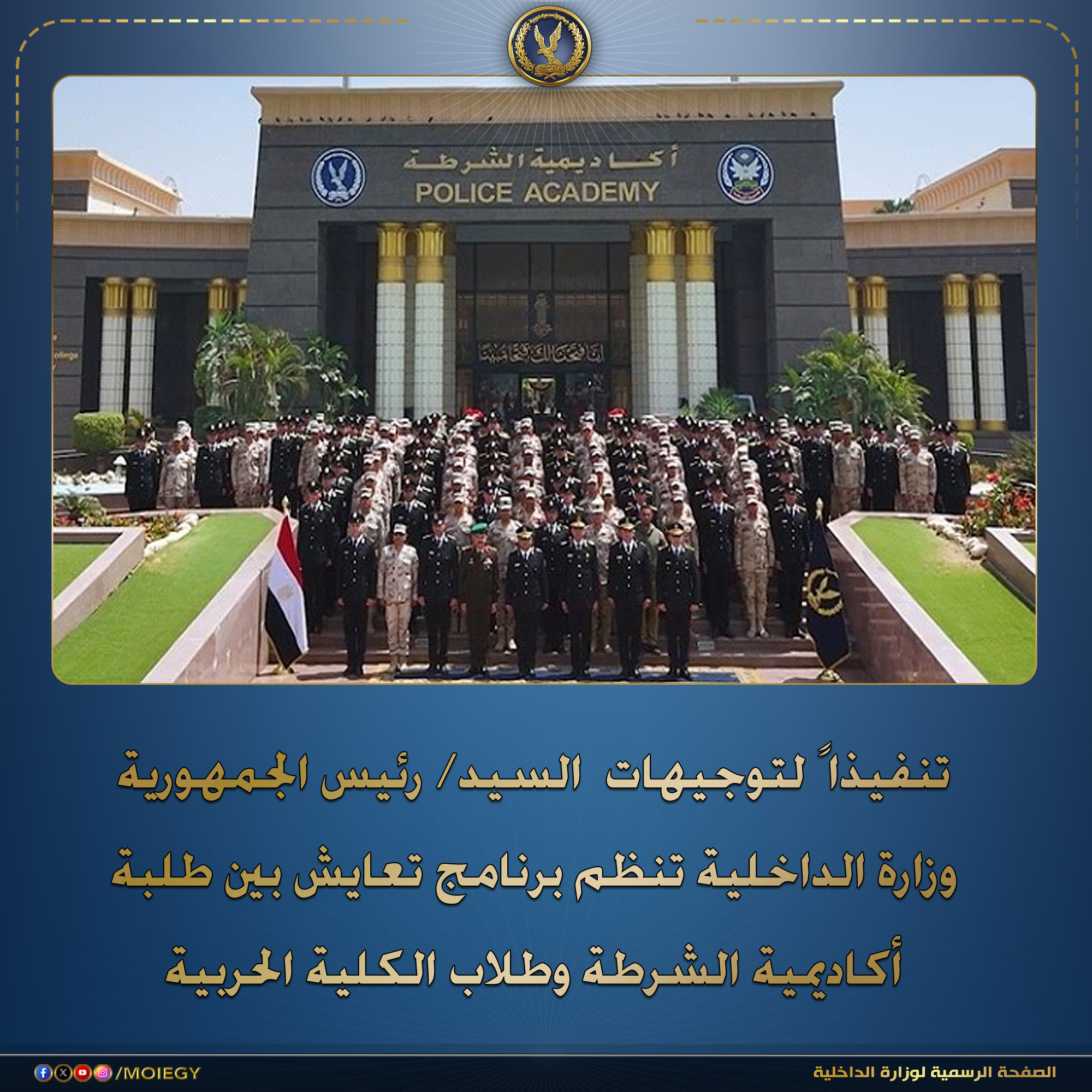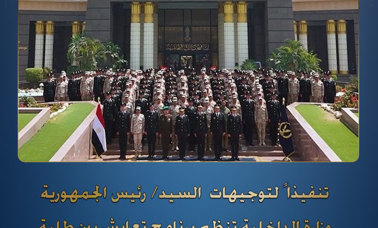 فى إطار توجيهات السيد الرئيس/ عبدالفتاح السيسى – رئيس الجمهورية .. نفذت وزارة الداخلية برنامجاً للمعايشة بين طلاب كلية الشرطة وطلاب الكلية الحربية من منطلق الحرص على توحيد المفاهيم التدريبية وترسيخ أطر التواصل بين جناحى أمن الوطن للتصدى بإحترافية وتنسيق كامل لكل من يحاول النيل من مقدرات الوطن وإستقراره.