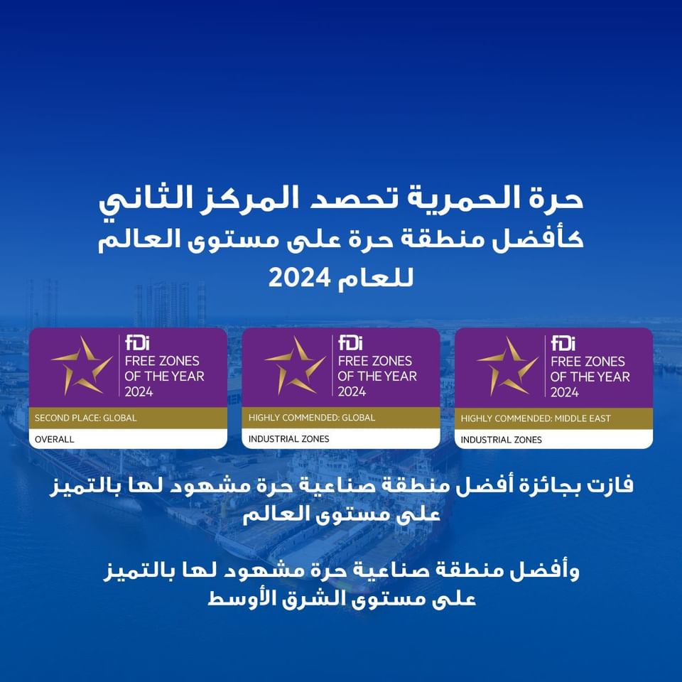 وحصدت “حرة الحمرية” المرتبة الثانية كأفضل منطقة حرة على مستوى العالم لعام 2024 بالإضافة إلى فوزها بفئة “أفضل منطقة صناعية حرة مشهود لها بالتميز على مستوى العالم” و”أفضل منطقة صناعية حرة مشهود لها بالتميز على مستوى الشرق الأوسط.