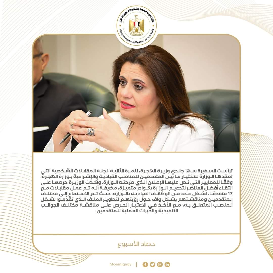 10- ترأست السفيرة سها جندي وزيرة الهجرة، للمرة الثانية، لجنة المقابلات الشخصية التي تعقدها الوزارة للاختيار ما بين المتقدمين للمناصب القيادية والإشرافية بوزارة الهجرة، وفقًا للمعايير التي نص عليها الإعلان الذي طرحته الوزارة. وأكدت الوزيرة حرصها على انتقاء أفضل العناصر لتدعيم الوزارة بكوادر متميزة، مضيفة أنه تم عمل مقابلات مع 17 متقدمًا، لشغل عدد من الوظائف القيادية بالوزارة، حيث تم الاستماع إلى مختلف المتقدمين ومناقشتهم بشكل واف حول رؤيتهم لتطوير الملف الذي تقدموا لشغل المنصب المتعلق به، مع الأخذ في الاعتبار الحرص على مناقشة مختلف الجوانب التنفيذية والخبرات العملية للمتقدمين.