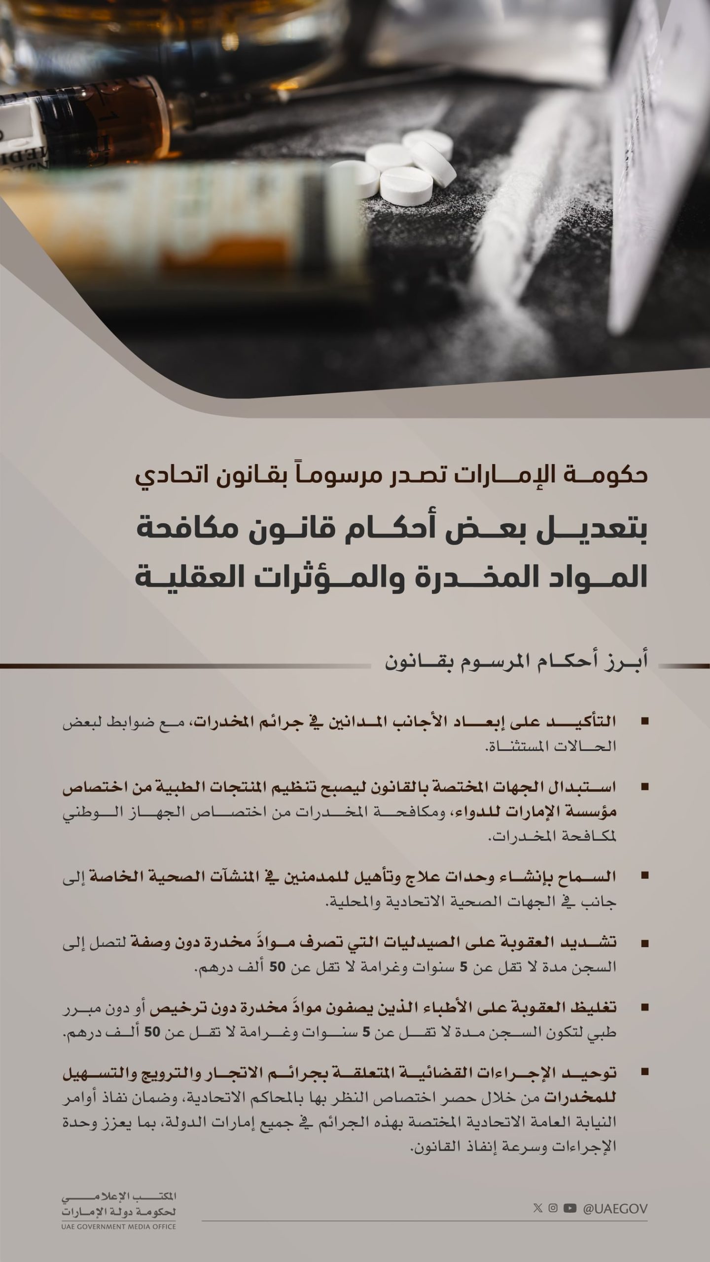 أصدرت حكومة الإمارات مرسوماً بقانون اتحادي بتعديل بعض أحكام المرسوم بقانون اتحادي بشأن مكافحة المواد المخدرة والمؤثرات العقلية، وذلك في إطار جهود دولة الإمارات المستمرة لتطوير منظومتها التشريعية، وتعزيز حماية المجتمع، وترسيخ مبادئ العدالة وصون الحقوق، ودعم المنظومة الوطنية لمكافحة المخدرات وفق أعلى المعايير التنظيمية والصحية والأمنية.