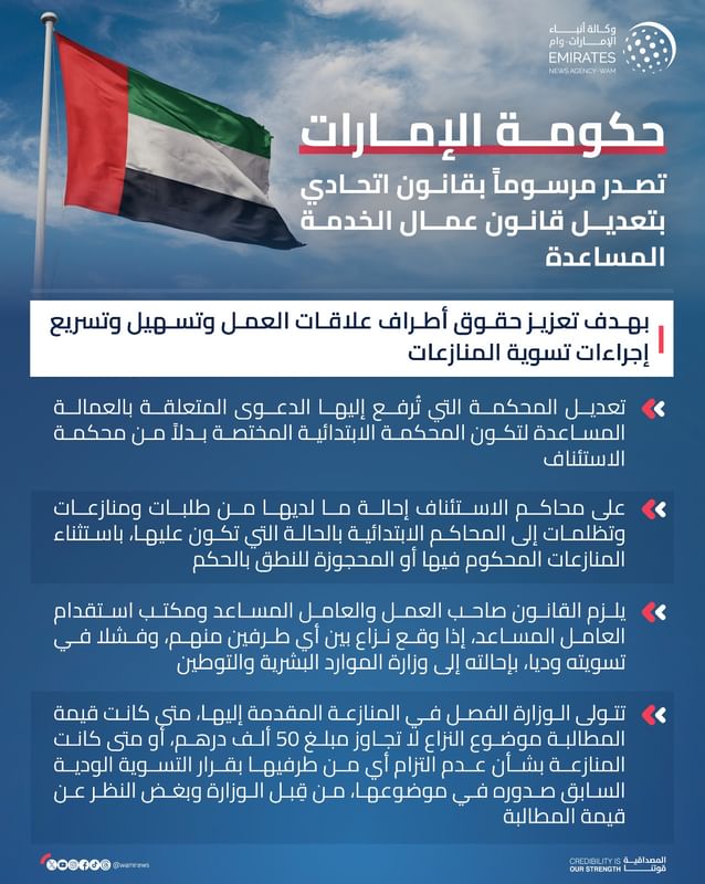 أصدرت حكومة دولة الإمارات مرسوما بقانون اتحادي، بتعديل بعض أحكام المرسوم بقانون اتحادي بشأن عمال الخدمة المساعدة، وذلك بهدف تعزيز حقوق أطراف علاقات العمل وتسهيل وتسريع إجراءات تسوية المنازعات.