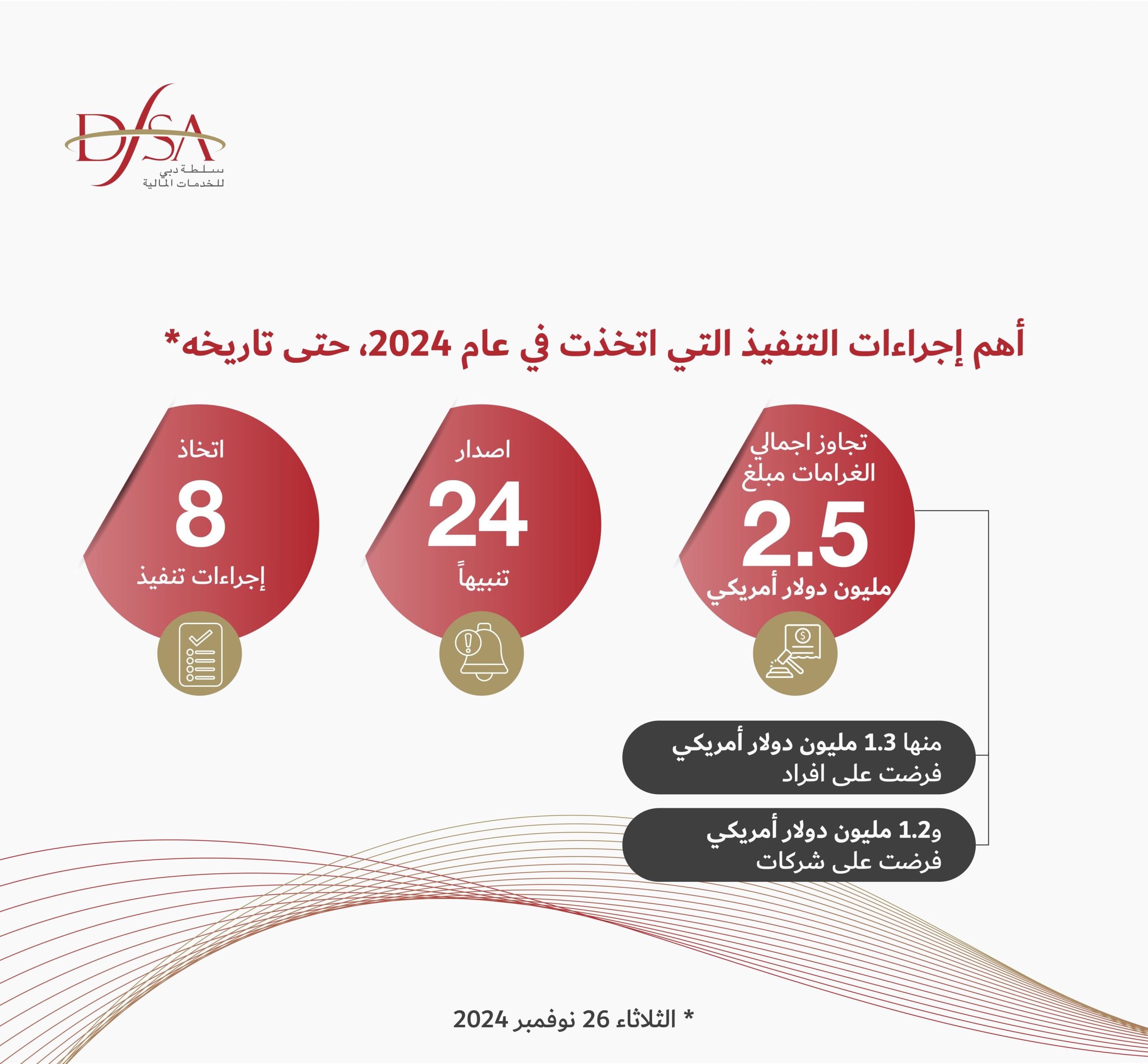 اتخذت سلطة دبي للخدمات المالية، الجهة المستقلة المنظمة للخدمات المالية التي تتم ممارستها في ومن مركز دبي المالي العالمي خلال 2024 ثمانية إجراءات تنفيذ وأصدرت 23 تنبيهاً.