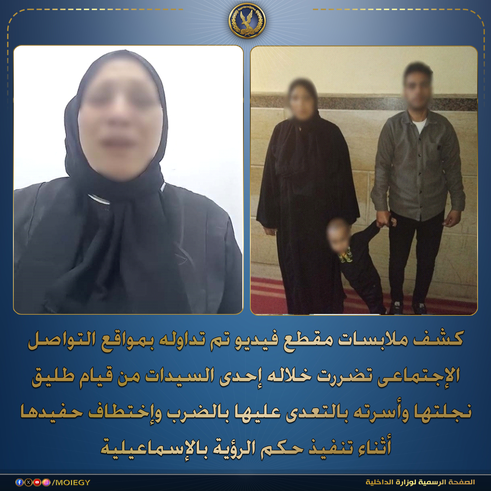 فى إطار كشف ملابسات مقطع فيديو تم تداوله بمواقع التواصل الإجتماعى تضررت خلاله إحدى السيدات من قيام طليق نجلتها وأسرته بالتعدى عليها بالضرب وإختطاف حفيدها أثناء تنفيذ حكم الرؤية بالإسماعيلية .