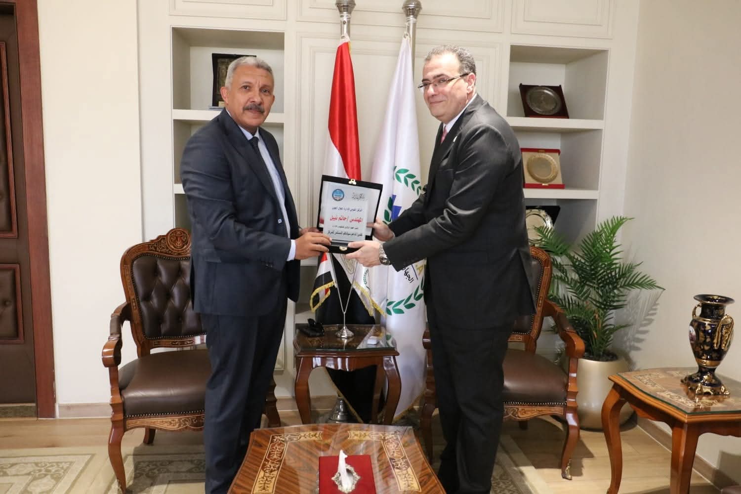 وفي ختام الزيارة، قدم اللواء الوليد الشرقاوي درع المركز تقديرًا للمهندس حاتم نبيل، تعبيرًا عن تقدير المركز للتعاون البناء ودور الجهاز في دعم ملفاته التنظيمية.