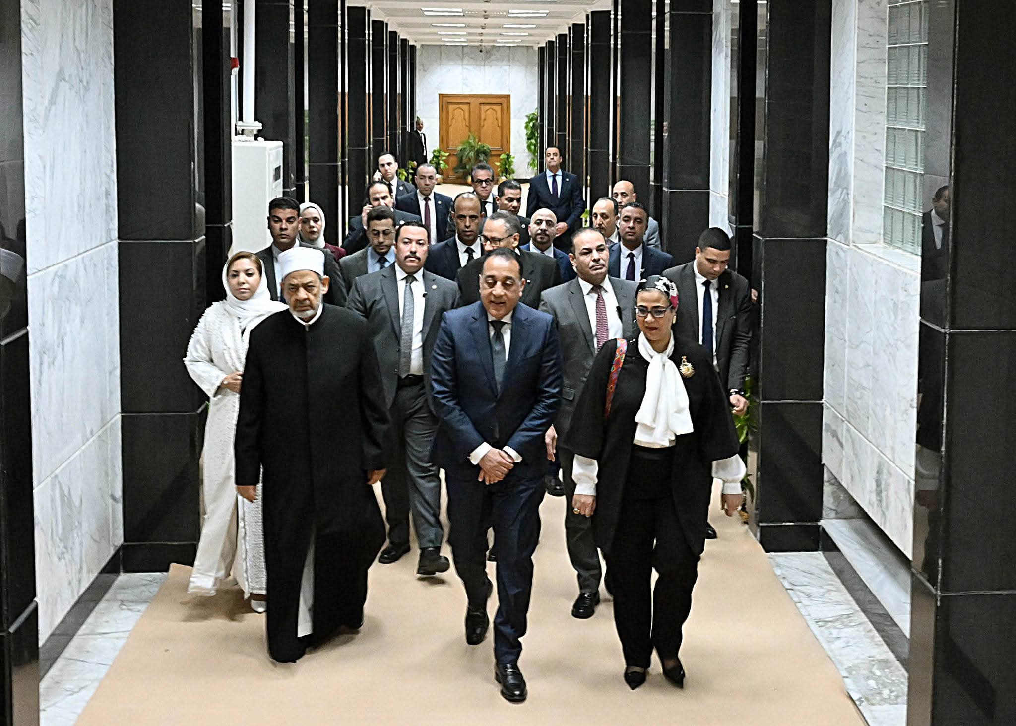 وكان في استقبال رئيس مجلس الوزراء لدى وصوله، فضيلة الإمام الأكبر، الدكتور أحمد الطيب، شيخ الأزهر الشريف، والسيدة المستشارة أمل عمار، رئيس المجلس القومي للمرأة، رئيس المجلس الوزاري لمنظمة تنمية المرأة.
