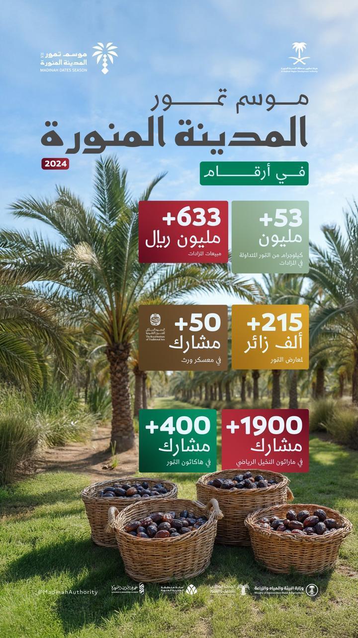 شهدت فعاليات موسم تمور المدينة المنورة التي أقيمت على مدار ثلاثة أشهر أكثر من 215 ألف زائر، بمبيعات تجاوزت 633 مليون ريال عبر “مزادات ” أكثر من 53 مليون كيلو جرامًا من التمور.