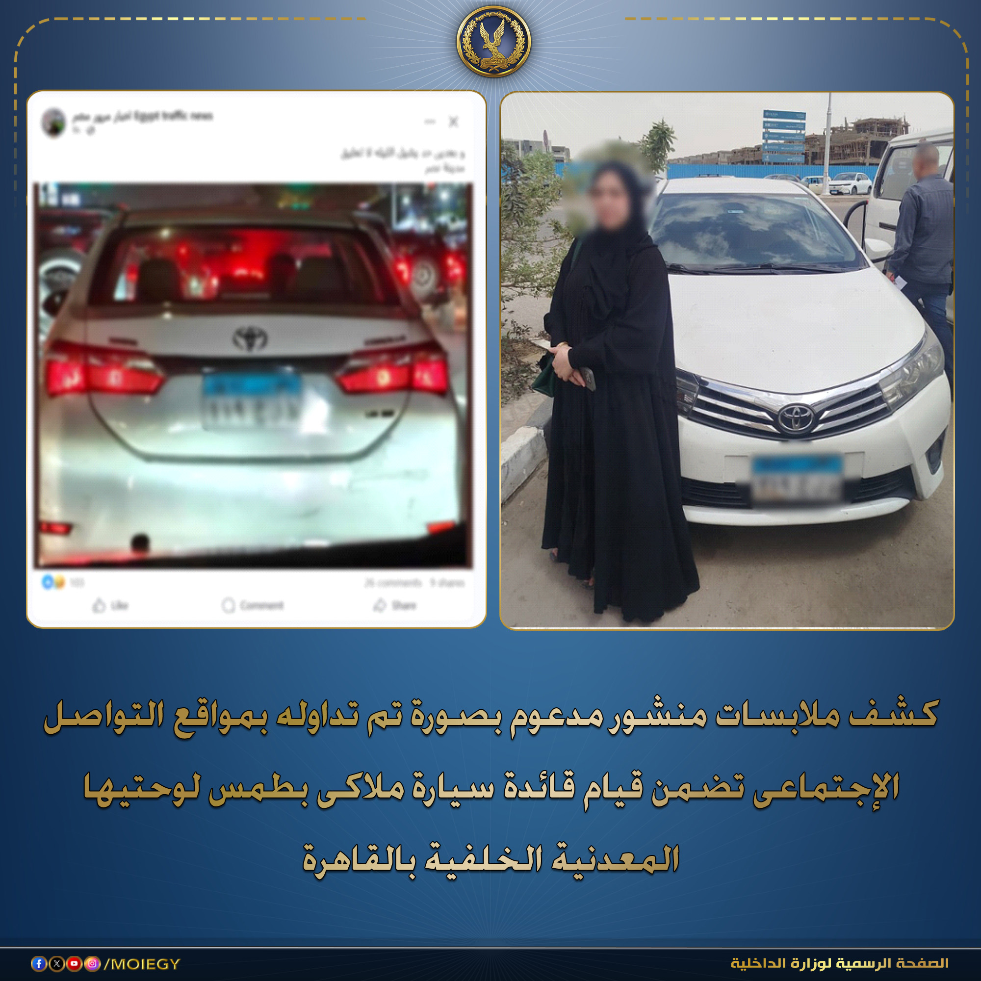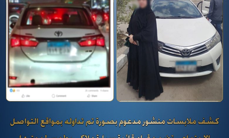 فى إطار كشف ملابسات منشور مدعوم بصورة تم تداوله بمواقع التواصل الإجتماعى تضمن قيام قائدة سيارة “ملاكى” بطمس لوحاتها المعدنية والتلاعب بأرقام اللوحة الخلفية بالقاهرة.