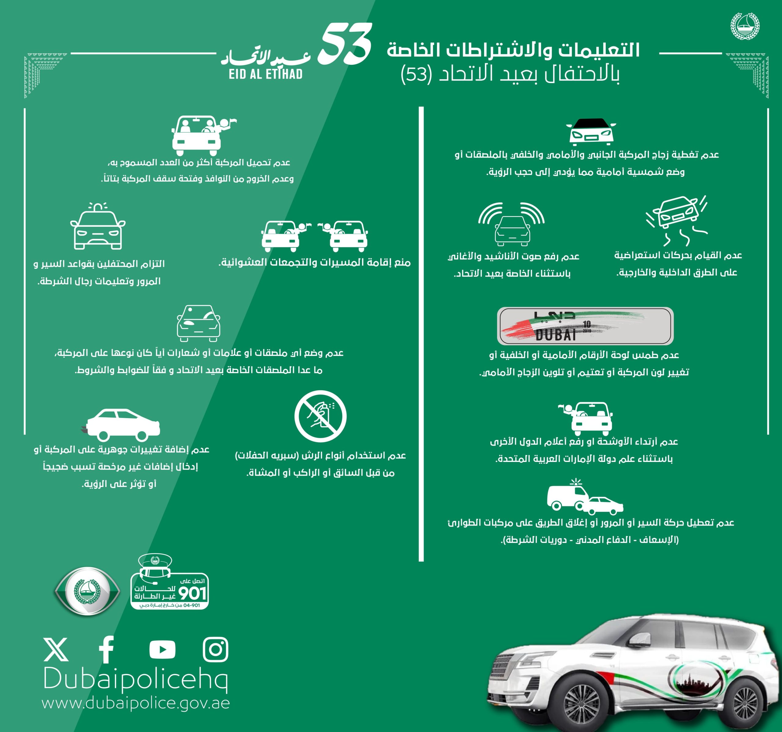 كما شدد على ضرورة عدم طمس لوحات أرقام المركبات الأمامية أو الخلفية، أو تغيير لون المركبة، أو تعتيم أو تلوين الزجاج الأمامي، وعدم وضع أي ملصقات أو شعارات على المركبة باستثناء الملصقات الخاصة بعيد الاتحاد وفق الضوابط والشروط المحددة.
