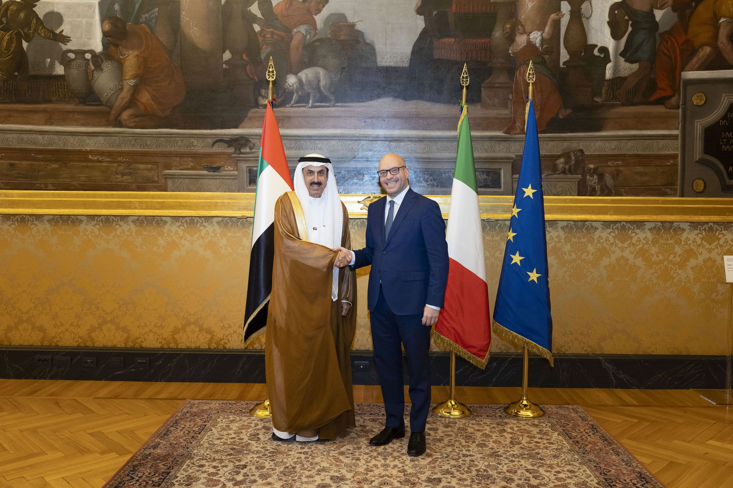 كما ثمن قرار الحكومة الإيطالية الجديد السماح لمواطني دولة الإمارات إتمام إجراءات الدخول والخروج عبر البوابات الإلكترونية في جميع مطارات إيطاليا، بما يعكس عمق العلاقات بين البلدين.