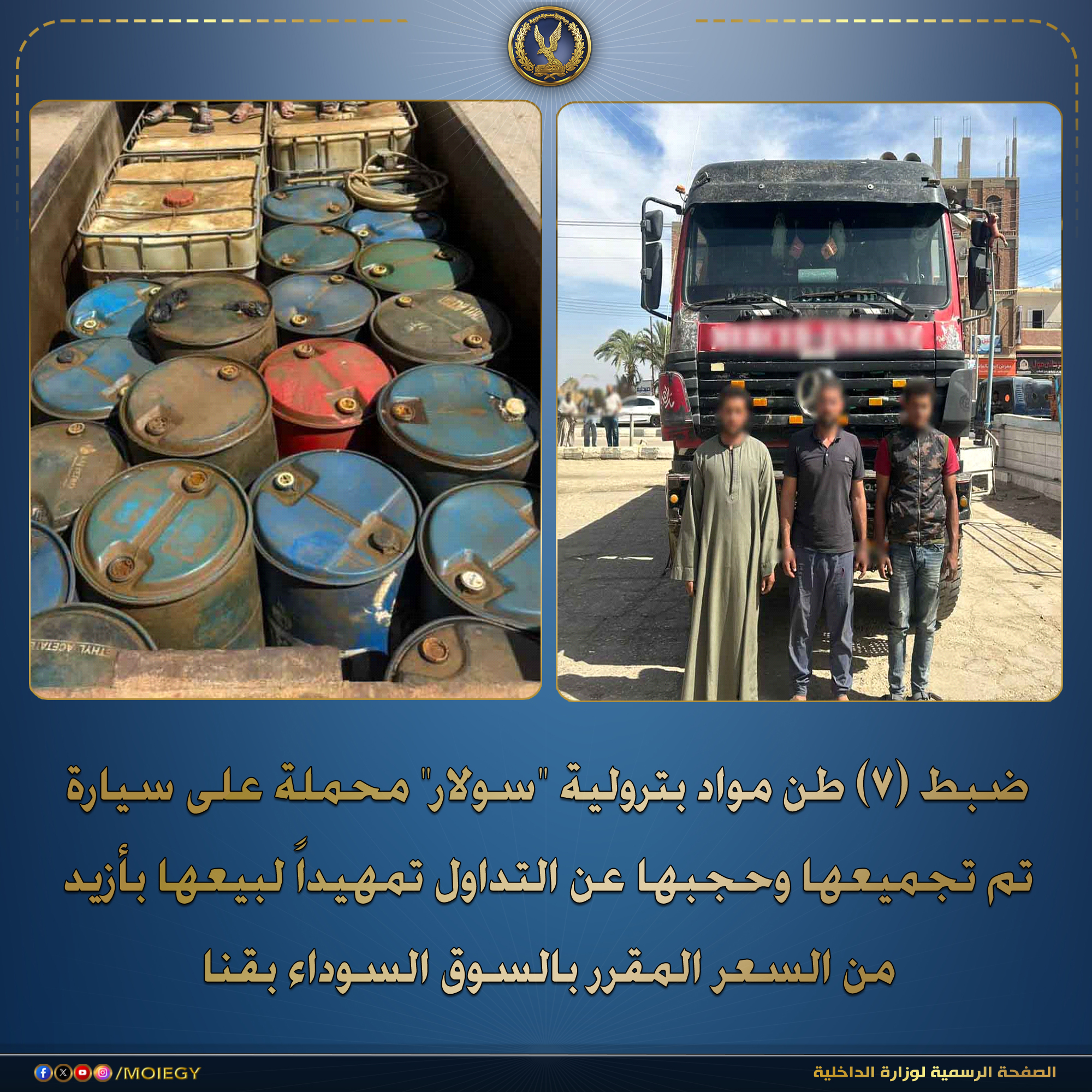 أكدت معلومات وتحريات قطاع الأمن العام، بالاشتراك مع مديرية أمن قنا، قيام شخصين (مقيمين بمحافظة سوهاج) بتكوين تشكيل تخصص في تجميع المواد البترولية المدعمة باستخدام سيارة نقل، بهدف الإتجار بها وتحقيق أرباح خيالية غير مشروعة.