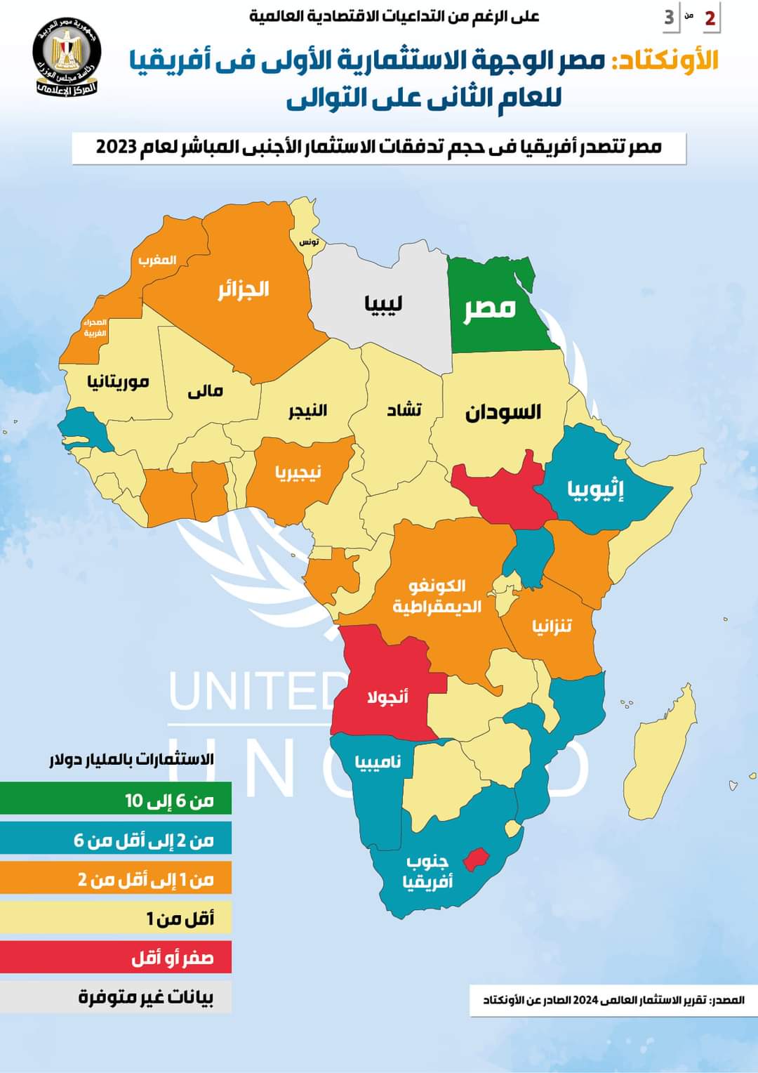 وفي هذا الصدد نشر المركز الإعلامي لمجلس الوزراء تقريراً تضمن إنفوجرافات تسلط الضوء على ما أورده تقرير الاونكتاد، بأن مصر الوجهة الاستثمارية الأولى في أفريقيا للعام الثاني على التوالي على الرغم من التداعيات الاقتصادية العالمية.