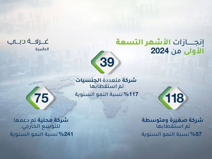 وتضمنت قائمة الشركات التي استقطبتها الغرفة خلال الأشهر التسعة الأولى من العام الجاري، 39 شركة متعددة الجنسيات مقارنة بـ 18 شركة في الفترة نفسها من عام 2023، بنمو بنسبة 117%.