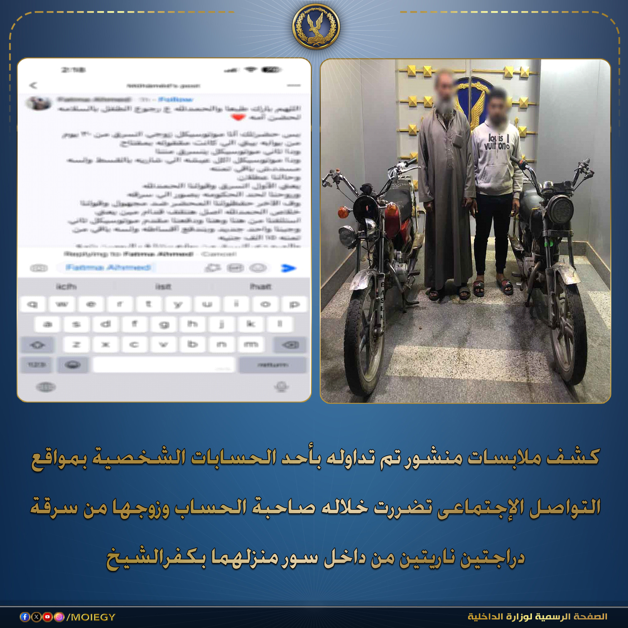 فى إطار كشف ملابسات منشور تم تداوله بأحد الحسابات الشخصية بمواقع التواصل الإجتماعى تضررت خلاله صاحبة الحساب وزوجها من سرقة دراجتين ناريتين من داخل سور منزلهما بكفرالشيخ.