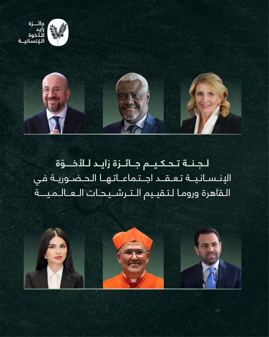 تعقد لجنة تحكيم جائزة زايد للأخوّة الإنسانية اجتماعاتها الحضورية في مدينتَي القاهرة وروما هذا الأسبوع، لمناقشة ملفات المرشحين من أكثر من 76 دولة حول العالم تمهيدًا لاختيار المُكرّم بالجائزة في دورتها السابعة لعام 2026.