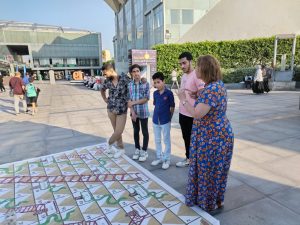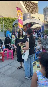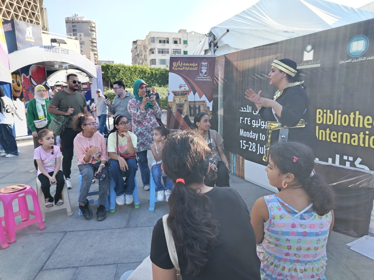 كما ان فريق عمل المؤسسة -شيماء الحلوجي وخديجة قرني ومارينا عيد – كان مرتدياً الزي المصري القديم مما جذب انتباه الجمهور والتفوا حولهم مستمعين لمعلوماتهم عن التاريخ والحضارة المصرية.