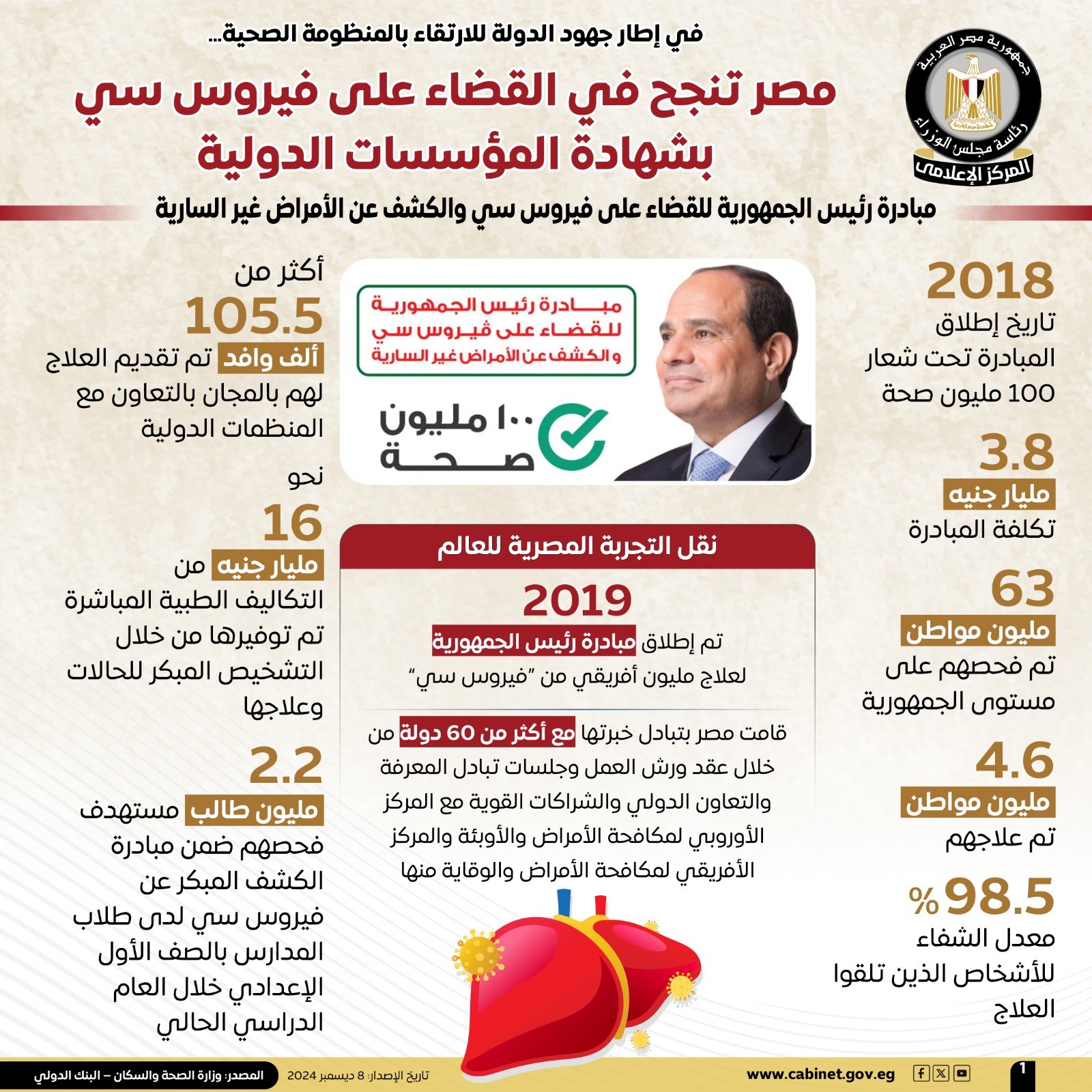 وفي هذا الصدد نشر المركز الإعلامي لمجلس الوزراء تقريرًا تضمن إنفوجرافات تسلط الضوء على نجاح مصر في القضاء على فيروس سي بشهادة المؤسسات الدولية، وذلك في إطار جهودها للارتقاء بالمنظومة الصحية.