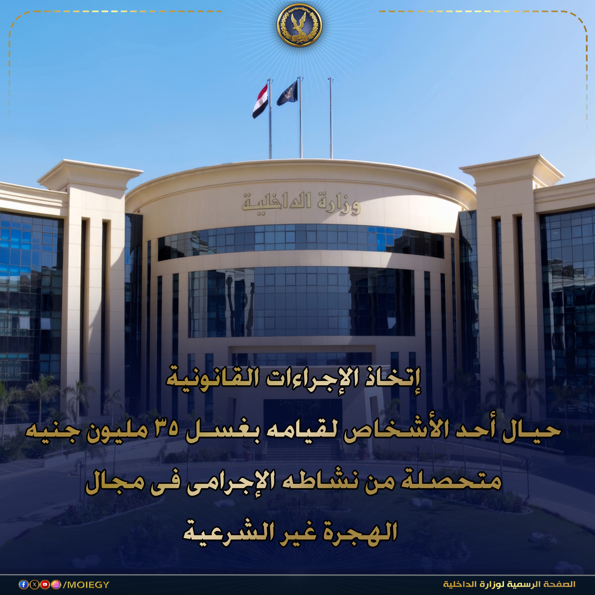 hستمراراً لجهود أجهزة وزارة الداخلية الرامية لمكافحة جرائم غسل الأموال وتتبع ثروات ذوى الأنشطة الإجرامية وحصر ورصد ممتلكاتهم وإتخاذ الإجراءات القانونية حيالهم.. فقد إضطلعت الإدارة العامة لمكافحة جرائم الأموال العامة بقطاع مكافحة جرائم الأموال العامة والجريمة المنظمة ، بالتنسيق مع أجهزة الوزارة المعنية بإتخاذ الإجراءات القانونية حيال (أحد الأشخاص – مقيم بالجيزة) لقيامه بغسل الأموال المتحصلة من نشاطه الإجرامى فى مجال الهجرة غير الشرعية بالمخالفة للقانون ومحاولته إخفاء مصدرها وإصباغها بالصبغة الشرعية وإظهارها وكأنها ناتجة عن كيانات مشروعة عن طريق (تأسيس الأنشطة التجارية – شراء الوحدات السكنية والسيارات).