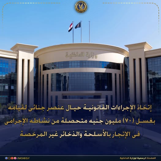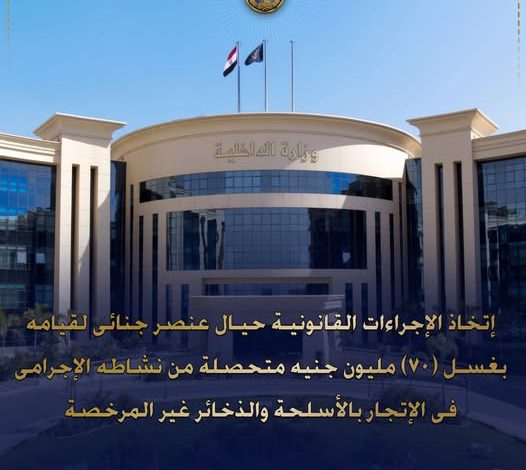 استمراراً لمكافحة جرائم غسل الأموال وتتبع ثروات ذوى الأنشطة الإجرامية وحصر ورصد ممتلكاتهم وإتخاذ الإجراءات القانونية حيالهم .. فقد إضطلعت الإدارة العامة لمكافحة الأسلحة والذخائر غير المرخصة بقطاع مكافحة المخدرات والأسلحة والذخائر غير المرخصة تنسيقاً وأجهزة الوزارة المعنية بإتخاذ الإجراءات القانونية حيال (عنصر جنائى – مقيم بأسيوط) لقيامه بغسل الأموال المتحصلة من نشاطه الإجرامى فى الإتجار بالأسلحة والذخائر غير المرخصة ، وترويجها ومحاولة إخفاء مصدرها وإصباغها بالصبغة الشرعية وإظهارها وكأنها ناتجة عن كيانات مشروعة عن طريق (شراء العقارات والأراضى والسيارات – تأسيس الأنشطة التجارية) .. هذا وقد قدرت القيمة المالية لأفعال الغسل بـ (70) مليون جنيه تقريباً.