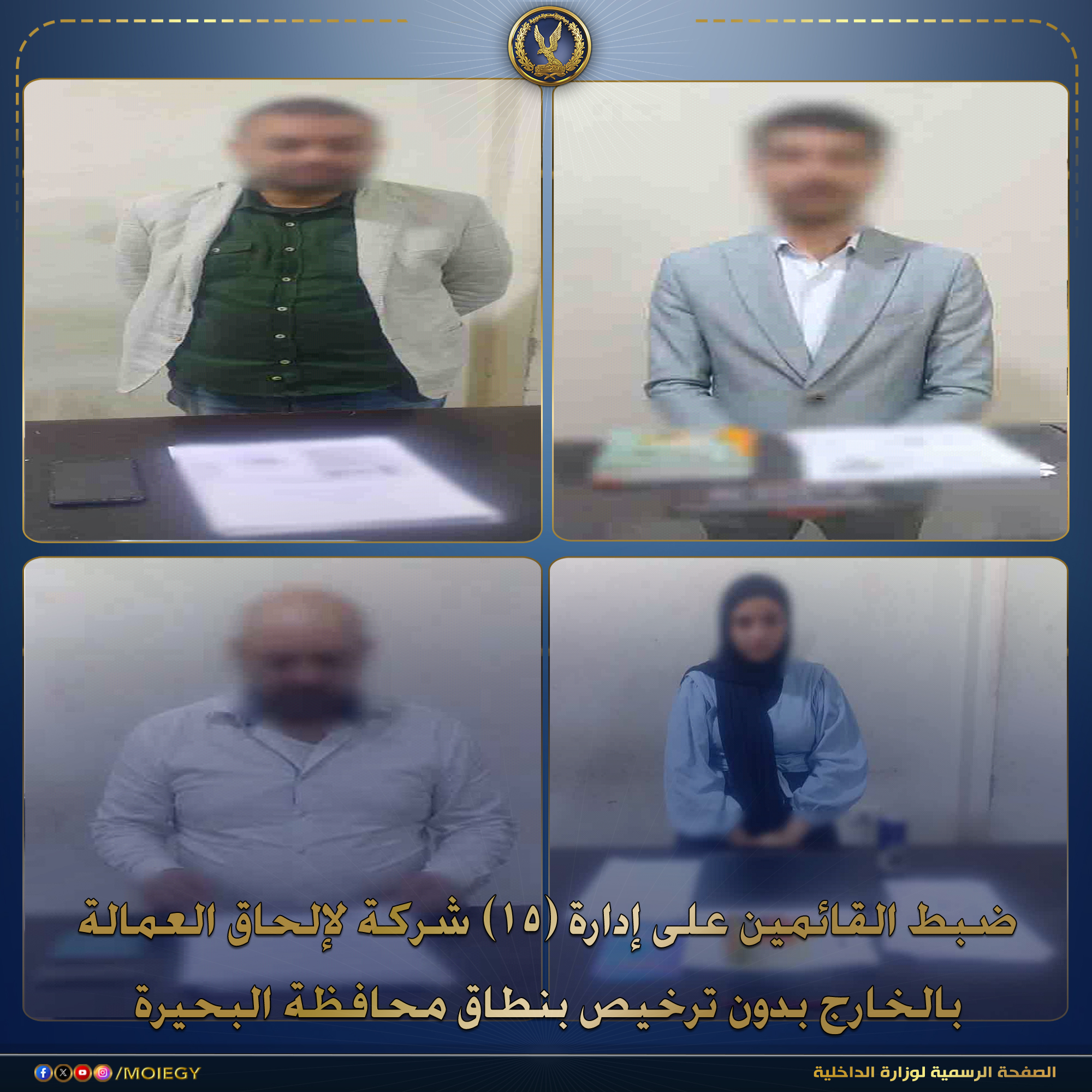 فى إطار جهود أجهزة وزارة الداخلية لمكافحة جرائم النصب والإحتيال على المواطنين والإستيلاء على أموالهم بزعم تسهيل سفرهم للعمل بالخارج.. فقد أكدت معلومات وتحريات الإدارة العامة لتصاريح العمل بقطاع الوثائق بالتنسيق مع أجهزة الوزارة المعنية قيام (15 شركة “غير مرخصة” لإلحاق العمالة بالخارج كائنة بنطاق محافظة البحيرة) بالنصب والإحتيال على المواطنين والإستيلاء على مبالغ مالية منهم ، وإيهامهم بقدرتهم على توفير فرص عمل لهم خارج البلاد، والترويج لنشاطهم الإجرامى عبر مواقع التواصل الإجتماعى .