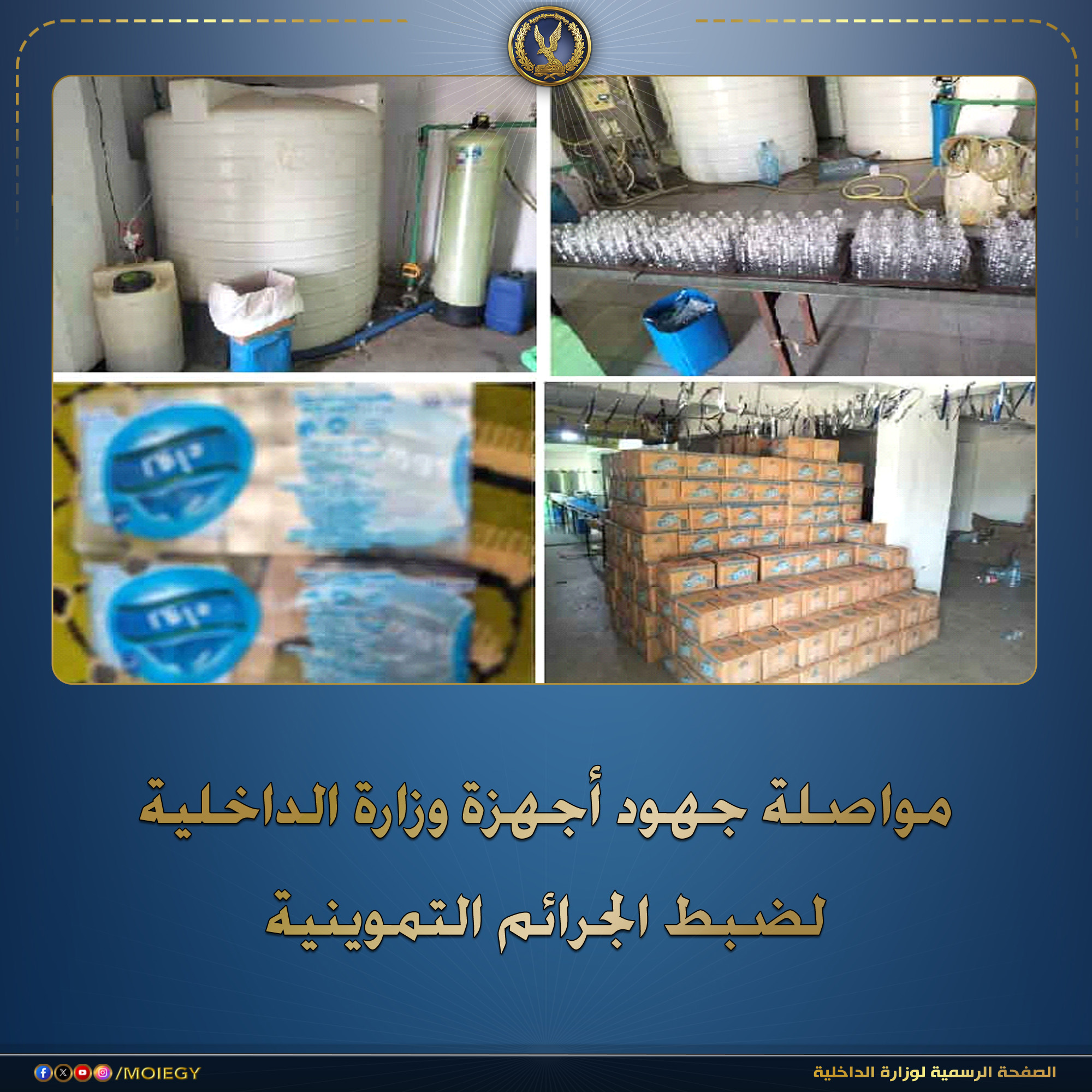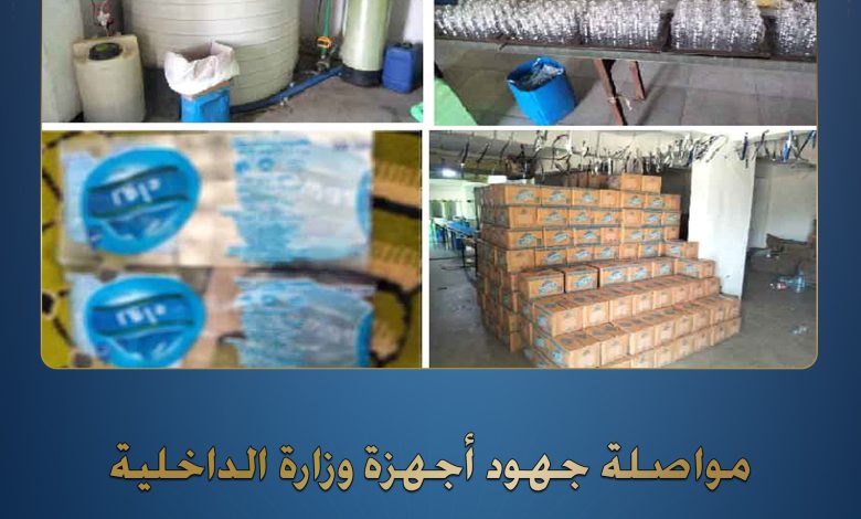 فقد تمكنت الإدارة العامة لشرطة التموين والتجارة الداخلية بقطاع الأمن الإقتصادى من ضبط (15 طن مياه معدنية لم تخضع للفحص المعملى– 4000 زجاجة مياه معدنية “مجهولة المصدر ومدون عليها علامات تجارية مغشوشة” – 14000 قطعة مستلزمات تعبئة) داخل مصنع لإنتاج المياه المعدنية “غير مرخص” ، كائن بدائرة مركز شرطة كفر الزيات بالغربية، تمهيداً لطرحها بالأسواق بقصد الغش والتدليس على جمهور المستهلكين لتحقيق أرباح غير مشروعة.