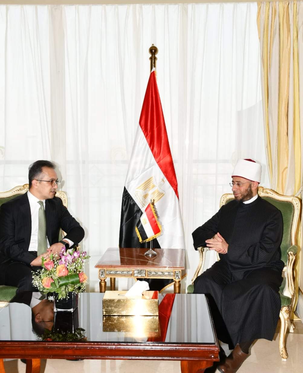 استقبل الدكتور أسامة الأزهري وزير الأوقاف رَامِن مَمَّدوف رئيس اللجنة الحكومية للعمل مع المنظمات الدينية بجمهورية أذربيجان والوفد المرافق له، وهم: السيد أنار رحيموف رئيس قسم التعاون الدولي باللجنة، والسيد إلخان بولوخوف سفير جمهورية أذربيجان في مصر، والسيد سيمور نصيروف رئيس الجالية الأذربيجانية في مصر على هامش مشاركتهم في المؤتمر الدولي الخامس والثلاثين للمجلس الأعلى للشئون الإسلامية الذي يُعقد في القاهرة يومي 25 و 26 أغسطس برعاية كريمة وسامية من سيادة الرئيس عبد الفتاح السيسي رئيس الجمهورية تحت عنوان: “دور المرأة في بناء الوعي”.