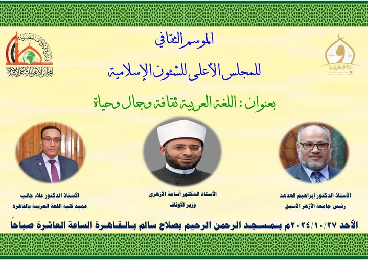 يفتتح الأستاذ الدكتور أسامة الأزهري وزير الأوقاف الموسم الثقافي الجديد غدًا الأحد، بحضور الأستاذ الدكتور إبراهيم الهدهد رئيس جامعة الأزهر الأسبق، والأستاذ الدكتور علاء جانب عميد كلية اللغة العربية بالقاهرة، من مسجد الرحمن الرحيم بصلاح سالم بالقاهرة الساعة العاشرة صباحًا.