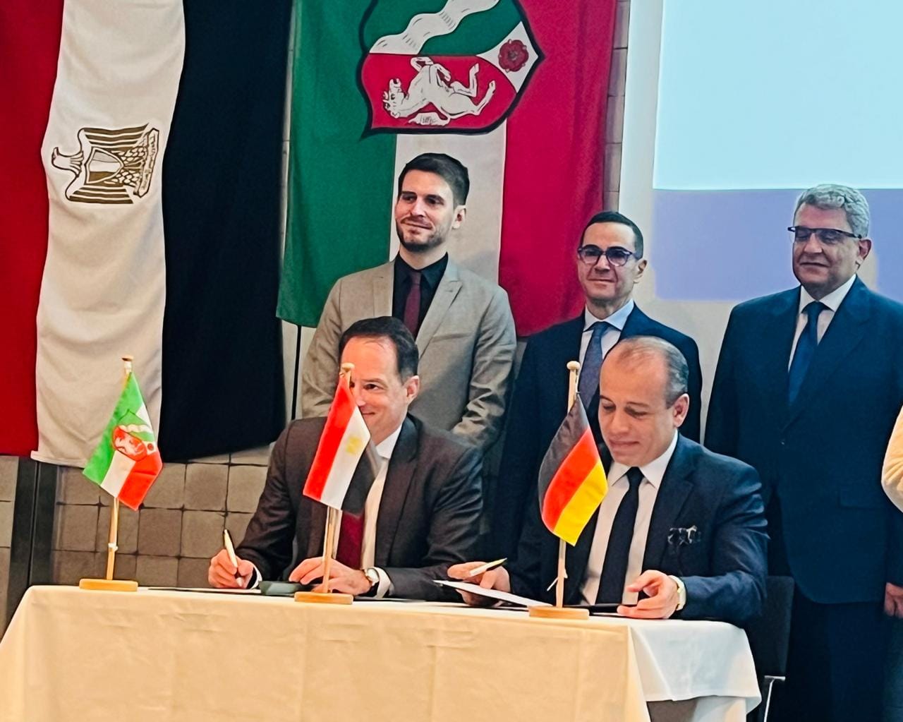 شهد المهندس حسن الخطيب وزير الاستثمار والتجارة الخارجية، ووزير الشؤون الاقتصادية بولاية شمال الراين مراسم توقيع إعلان تعاون مشترك بين التمثيل التجاري المصري ونظيره بالولاية NRW Global business.