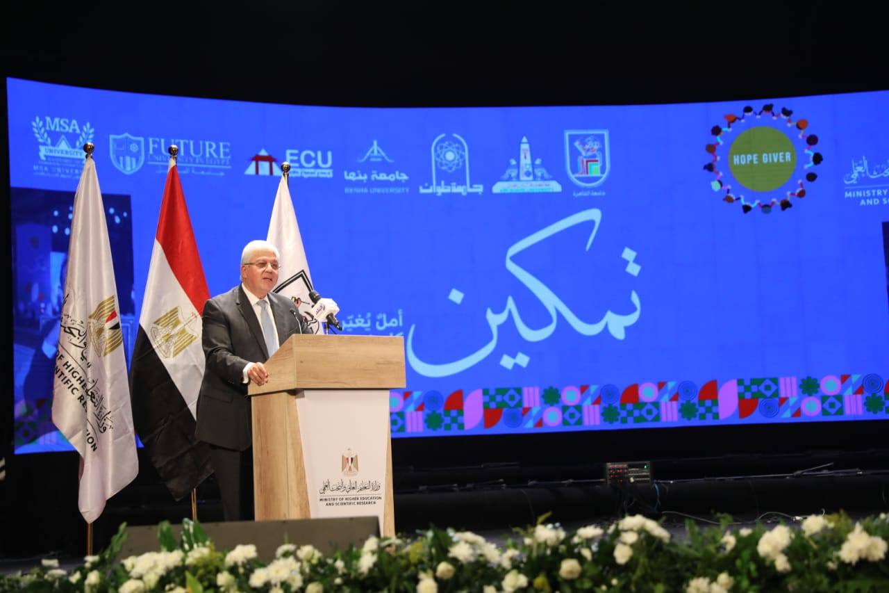 شهد الدكتور أيمن عاشور وزير التعليم العالي والبحث العلمي، الاحتفال بإطلاق مبادرة “تمكين”، التي تنفذها الوزارة بالتعاون مع حملة “مانحي الأمل” العالمية، للتوعية بحقوق وواجبات الطلاب ذوي الهمم داخل الجامعات المصرية، وتوفير فرص متكافئة لهم، وذلك بمقر جامعة القاهرة، بحضور الدكتور محمد سامي رئيس جامعة القاهرة، ورؤساء جامعات إقليم القاهرة الكبرى، ولفيف من قيادات الوزارة والجامعة، وحملة مانحي الأمل العالمية.