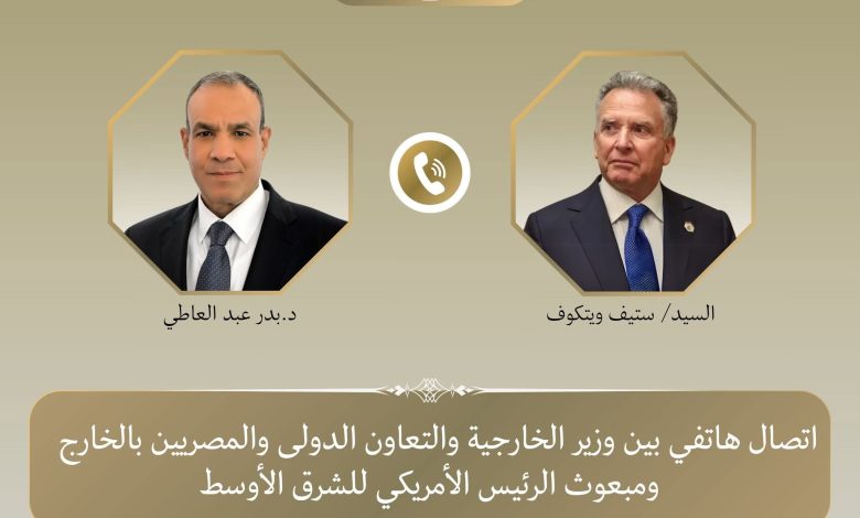 تلقى د. بدر عبد العاطي وزير الخارجية والتعاون الدولي والمصريين بالخارج اتصالًا هاتفيا يوم الاثنين ٢٧ أبريل من ستيف ويتكوف المبعوث الأمريكي الخاص للشرق الأوسط، وذلك للتشاور حول مسار المفاوضات الأمريكية – الإيرانية والجهود المبذولة لخفض التصعيد فى المنطقة.